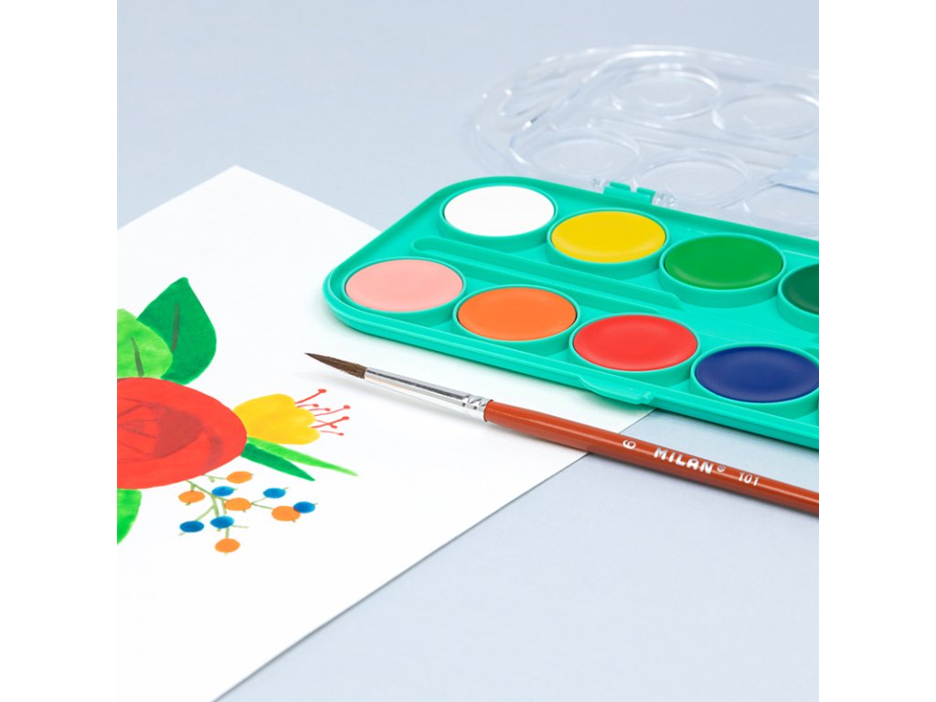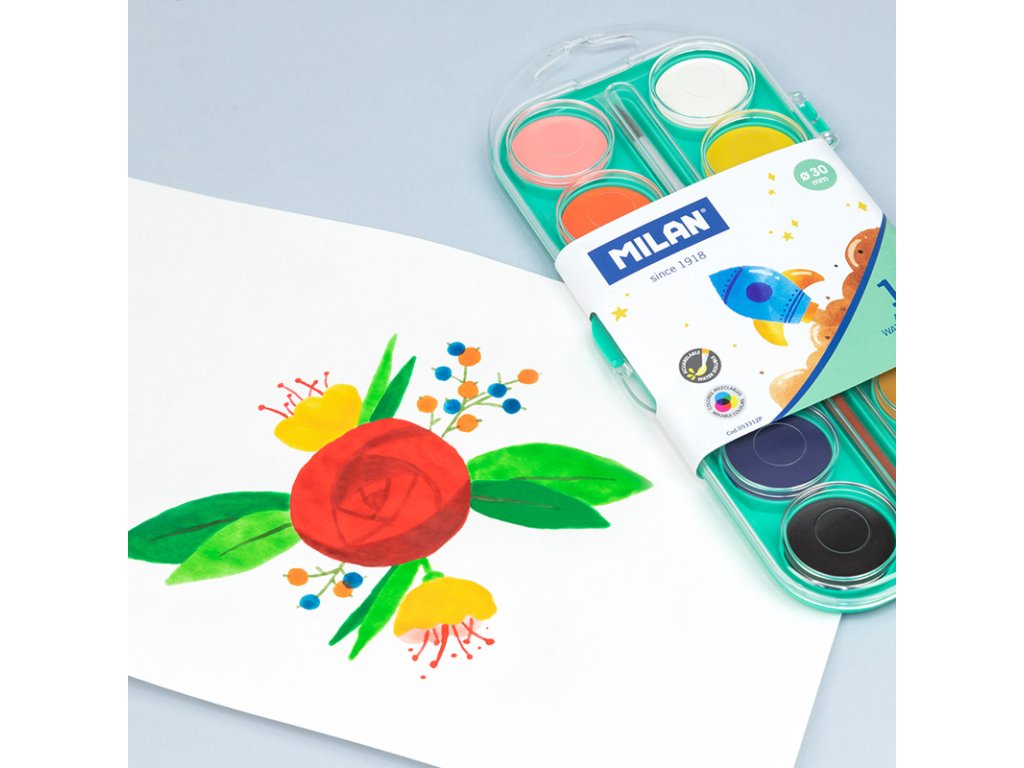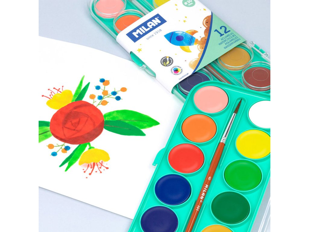 Akvarelové barvy MILAN jsou určeny na malování na papír a jiné savé materiály, ředěné vodou. Netoxické, 12 barev s průměrem 30 mm, dodávané se štětcem v plastovém ochranném pouzdře. Viskózní a krycí barva. Barvy se dají snadno vyklidit z většiny látek.Doplňkové parametry