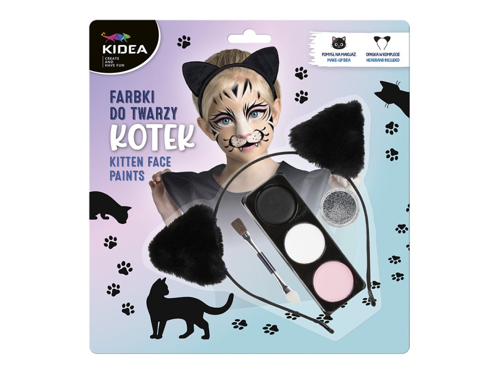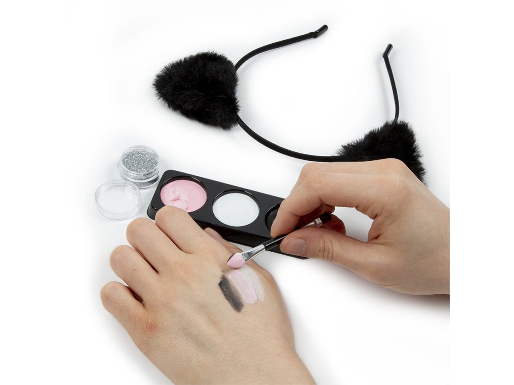 Barvy na obličej s čelenkou s kočičíma ušima. Sada obsahuje tři barvy: černou, růžovou a bílou, stříbrné tělové třpytky a štětec. Sada vám pomůže přeměnit se na kotě ve čtyřech jednoduchých krocích, nebo si můžete pohrát s barvami prostřednictvím originálního stylingu. Tento jedinečný make-up bude ideální pro kostýmní párty, karneval nebo Halloween. Barviva velmi dobře kryjí, snadno se roztírají. Barvy jsou bezpečné pro používání díky laboratorním testům.Doplňkové parametry