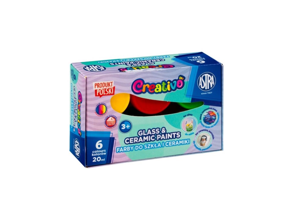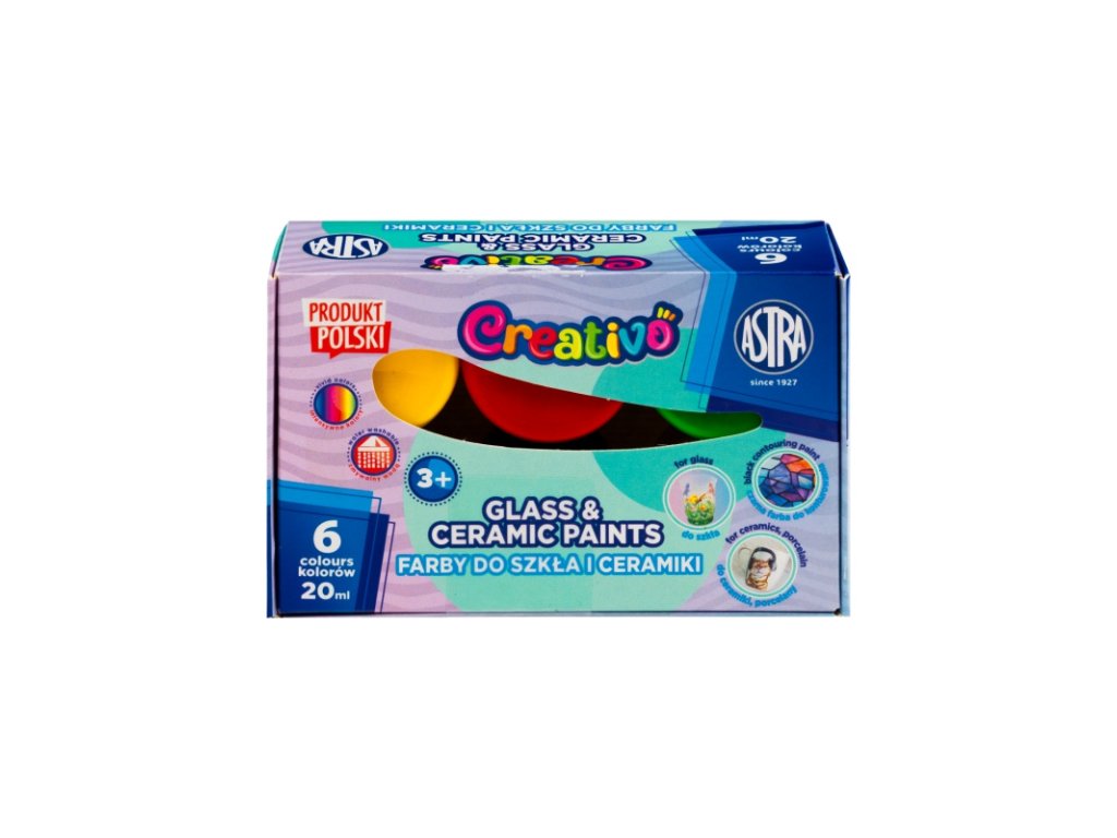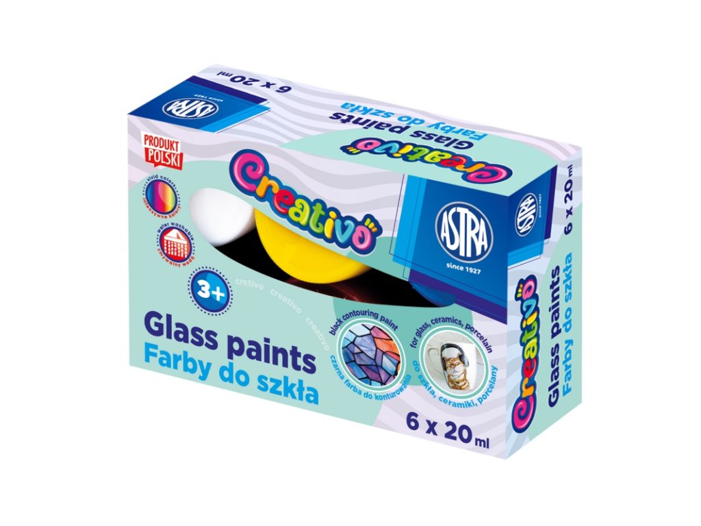 Souprava ASTRA Creativo obsahuje 6 průhledných barev na sklo po 20 ml. Ideální k dekorování skla, porcelánu či keramiky. Vyrobeno v Polsku, vhodné pro děti od 3 let.