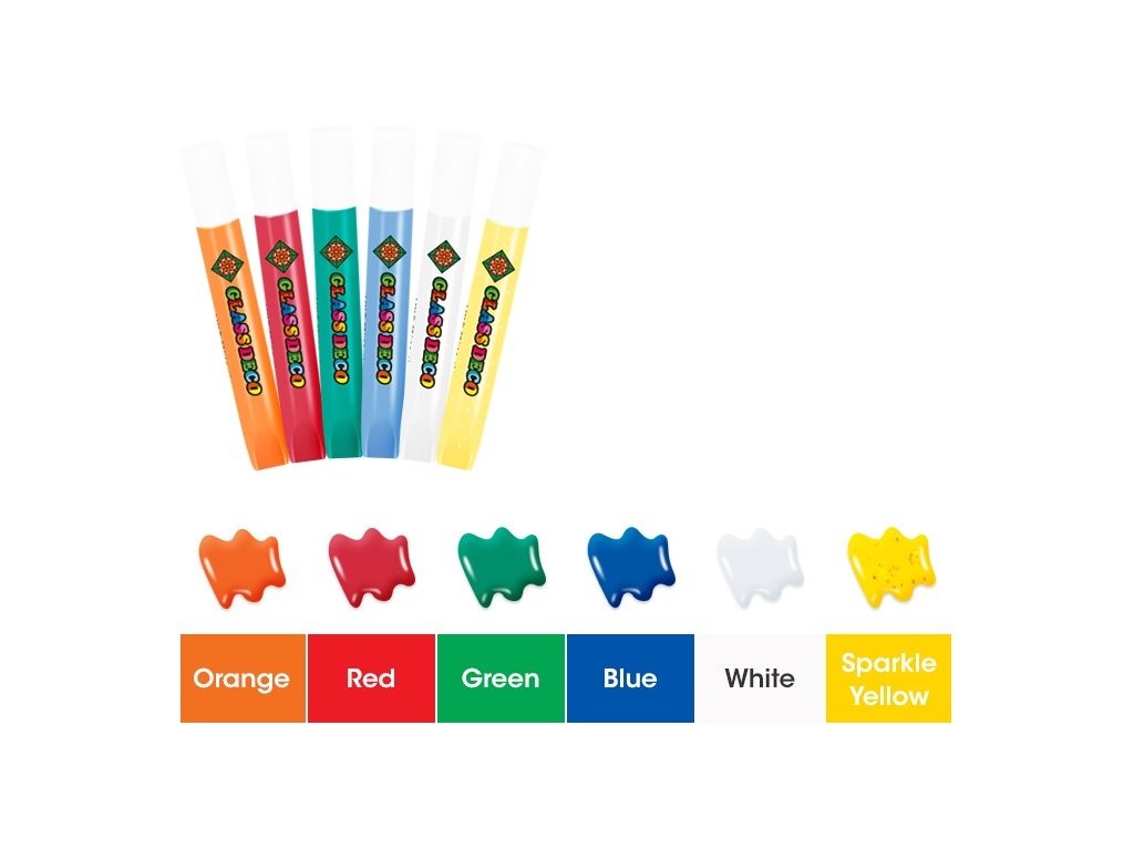 - 5 ks farieb na sklo (10,5 ml): oranžová, červená, zelená, modrá, biela