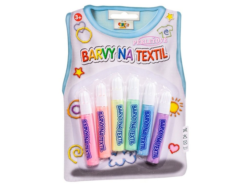 Balení obsahuje: 6 barev v tužce 7 ml (růžová, oranžová, žlutá, zelená, modrá, fialová)Doporučujeme tyto barvy používat na světlý podklad. Barvy jsou voděodolné, tzn. že se nevyperou. Pokud chcete širší paletu barev, můžete barvy namíchat. Postup: Nejdříve látku (případně tričko) vyperete, aby barvy lépe přilnuly. Víčko tahem otevřete. Do vypraného trička vložte podložku (karton), abyste předešli prosáknutí. Mírným tlakem nanášejte barvu přímo na textil. Doporučujeme si obrázek předkreslit obyčejnou tužkou. Hotový výrobek nechte na rovné ploše zaschnout 4-6 hodin. Nevhodné pro děti do 3 let. Velikost balení: 15 x 20 cm.Doplňkové parametry