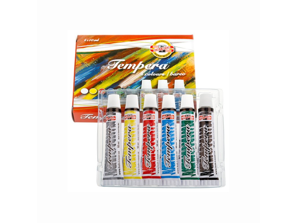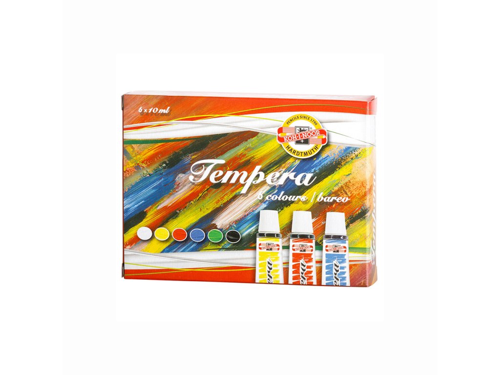 10-kusová barevná sada temperových barev, objem 10 x 10 ml, dodávaná v papírovém obalu. Sada obsahuje barvy: běloba titanová, žlutá citronová, rumělka červená, sráž alizarinová, kobalt imitace, ultramarín, zeleň světlá, zeleň tmavá, siena pálená, čerň kostní. Barvy jsou určeny na malování na papír, karton, dřevo a jiné materiály. Jsou ředitelné vodou.Doplňkové parametry