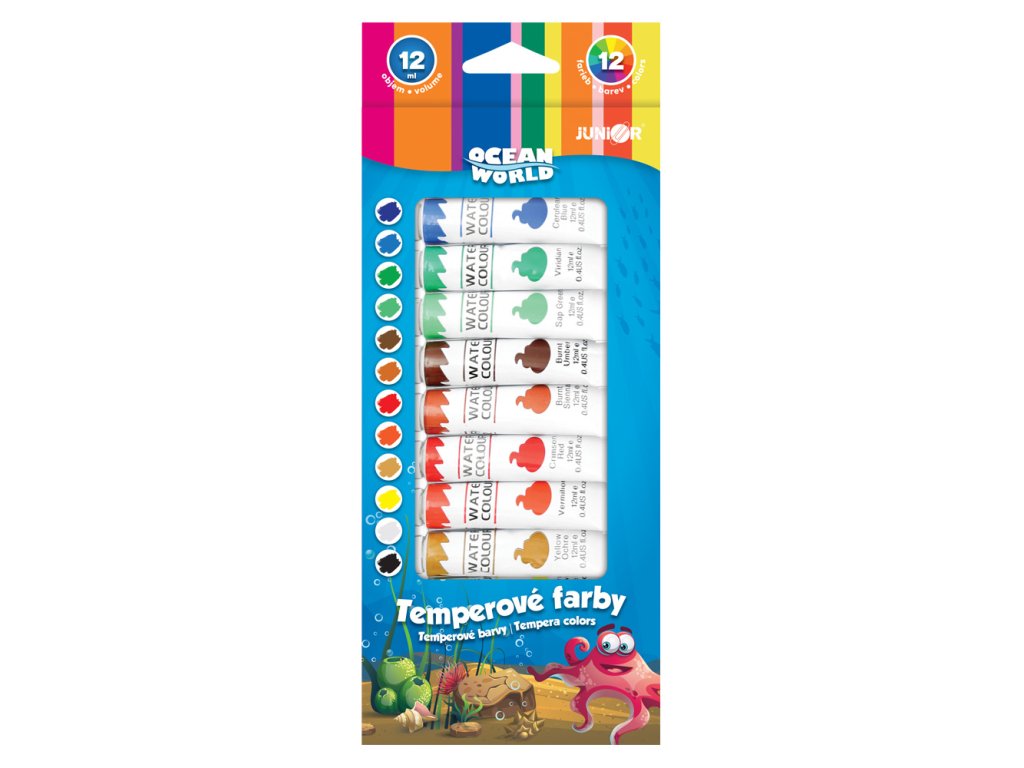 Temperové barvy v jasných odstínech. Barvy lze nejlépe použít na papír, kartón, lepenku. Sada obsahuje 12 barev o objemu 12ml uložených v papírové krabičce. Rozměr balení: 10,5x25 cm.Doplňkové parametry