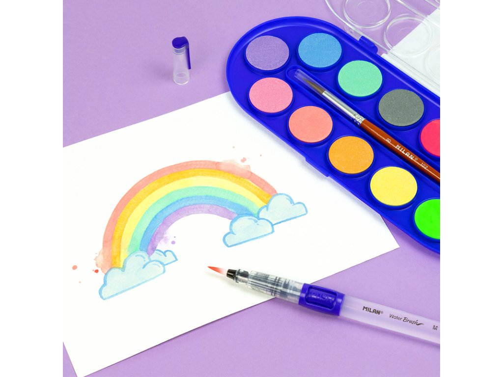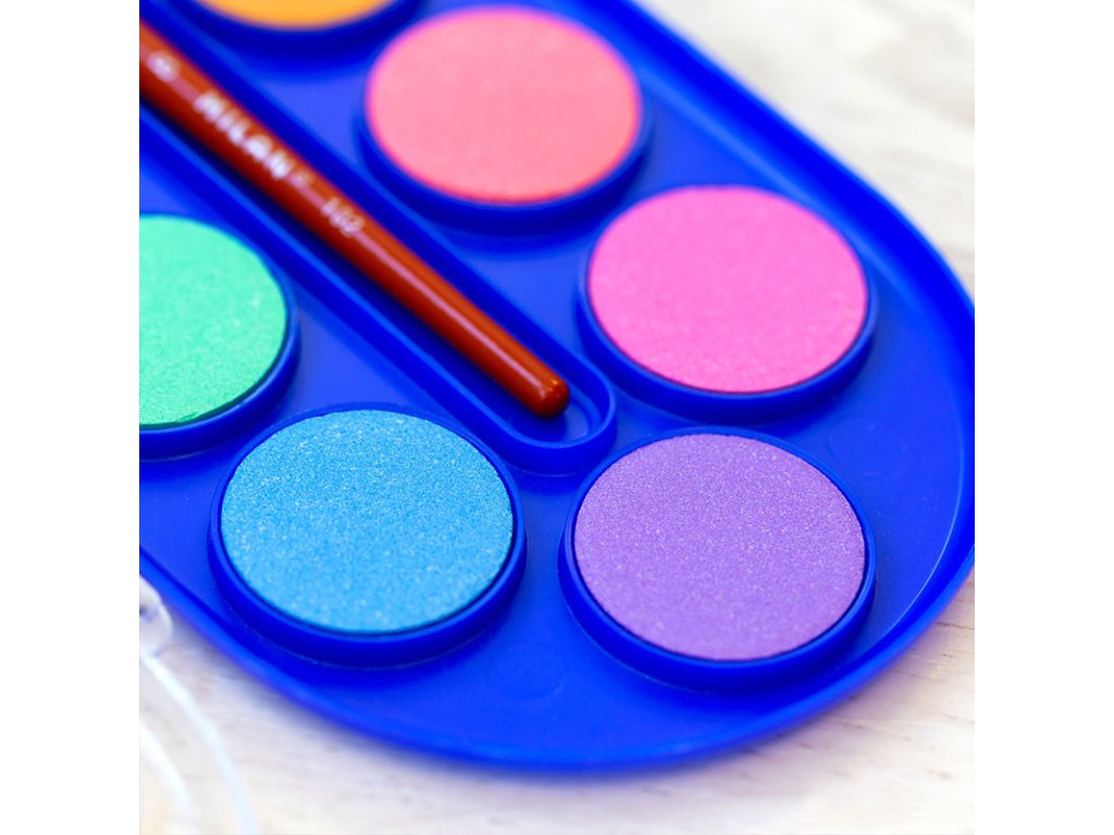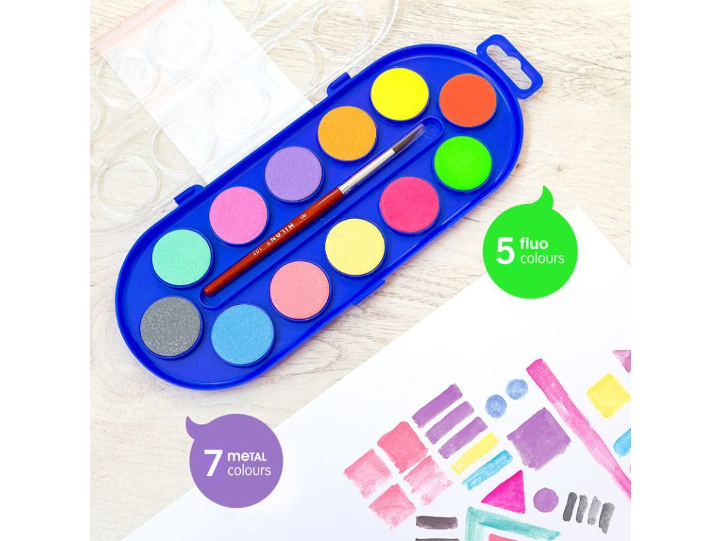 Vodové barvy MILAN, netoxické, 12 barev s průměrem 30 mm, dodávané se štětcem v plastovém ochranném pouzdře.Doplňkové parametry