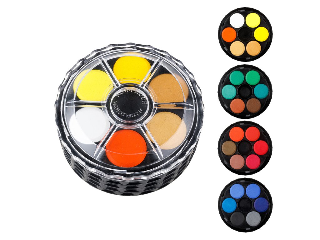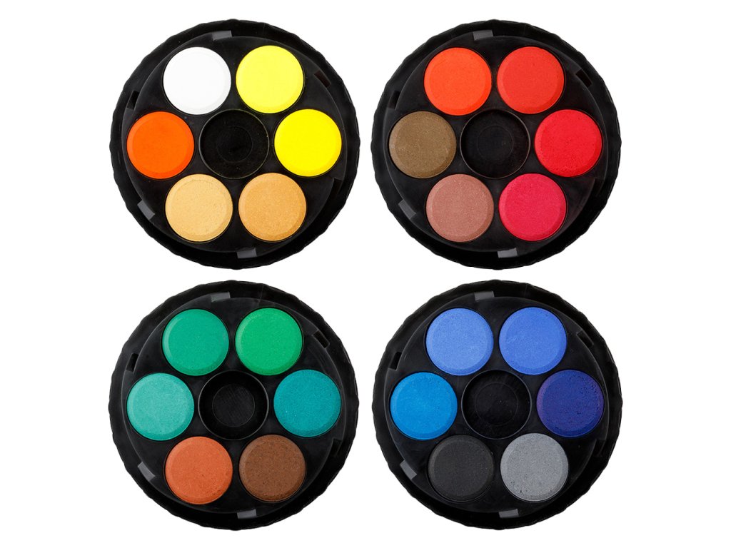 24-barevná sada netoxických vodových barev dodávána v kulatém plastovém boxu. Průměr tablety 22,5 mm, vodou ředitelné, vhodné na papír a jiné savé materiály, 4 vrstvy po 6 tabletách, tj 24 odstínů barev. Barvy jsou vodou ředitelné, vhodné na papír a jiné savé materiály.Doplňkové parametry