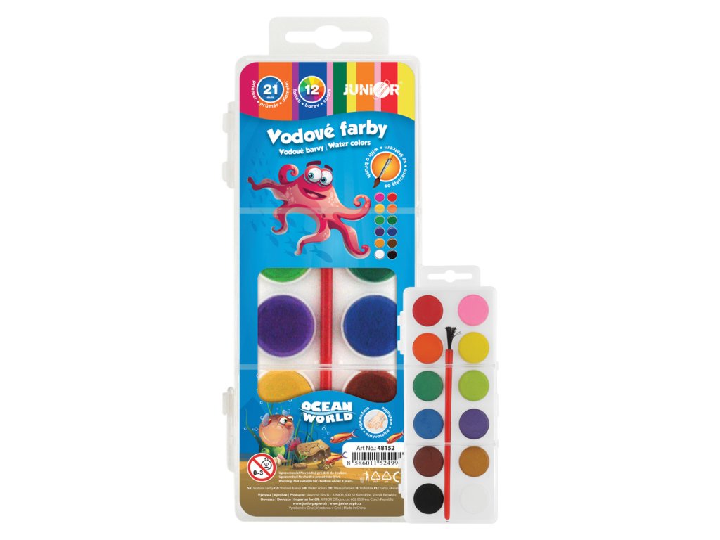 Vodové barvy jsou určeny pro malování na papír a jiné savé materiály, ředitelné vodou. Tableta obsahuje 12 barev o ??průměru 2,1 cm. Součástí balení je i štětec. Rozměr: 8x18 cm.Doplňkové parametry