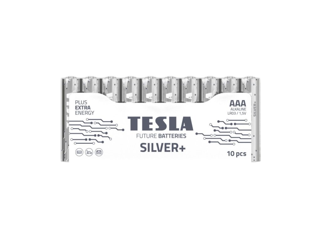 Jednorázová baterie řada TESLA SILVER+ zahrnuje alkalické baterie určené pro přístroje s dlouhodobým vysokým odběrem elektrické energie. Představuje ideální volbu pro elektronické hračky. - tato řada specifikuje dlouhotrvající výdrž baterie při stálém energetickém zatížení - jednorázová, alkalická baterie, není určena k nabíjení AAA 1,5V (LR03) Balení obsahuje 10 ks baterií.Doplňkové parametry