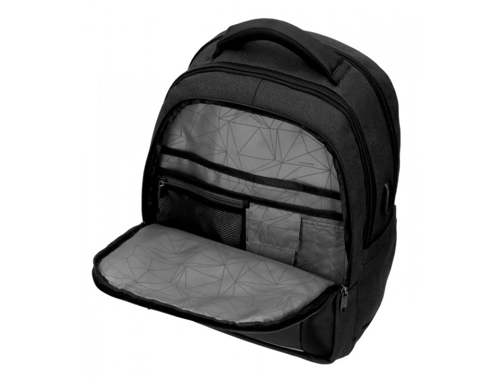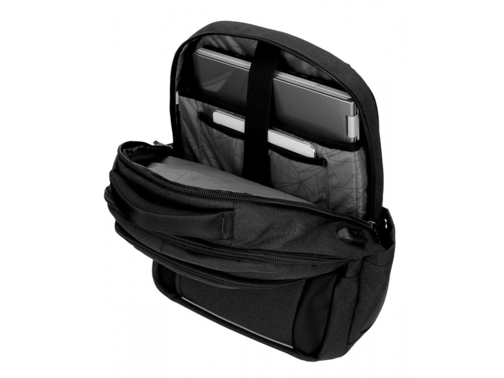 Vnitřní prostor batohu disponuje hlavní kapsou pro dokumenty či notebook, přední kapsa svým uživatelům nabízí pořadač pro drobné věci, jako je telefon, pera či vizitky.