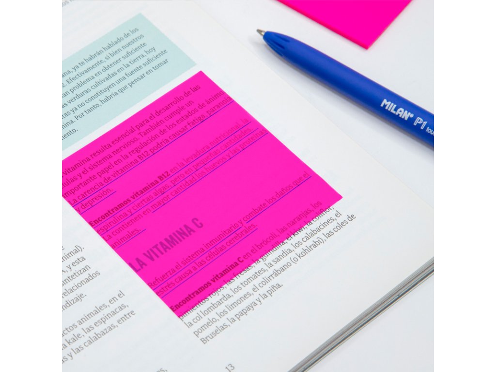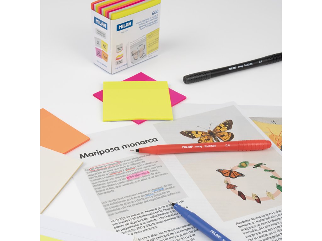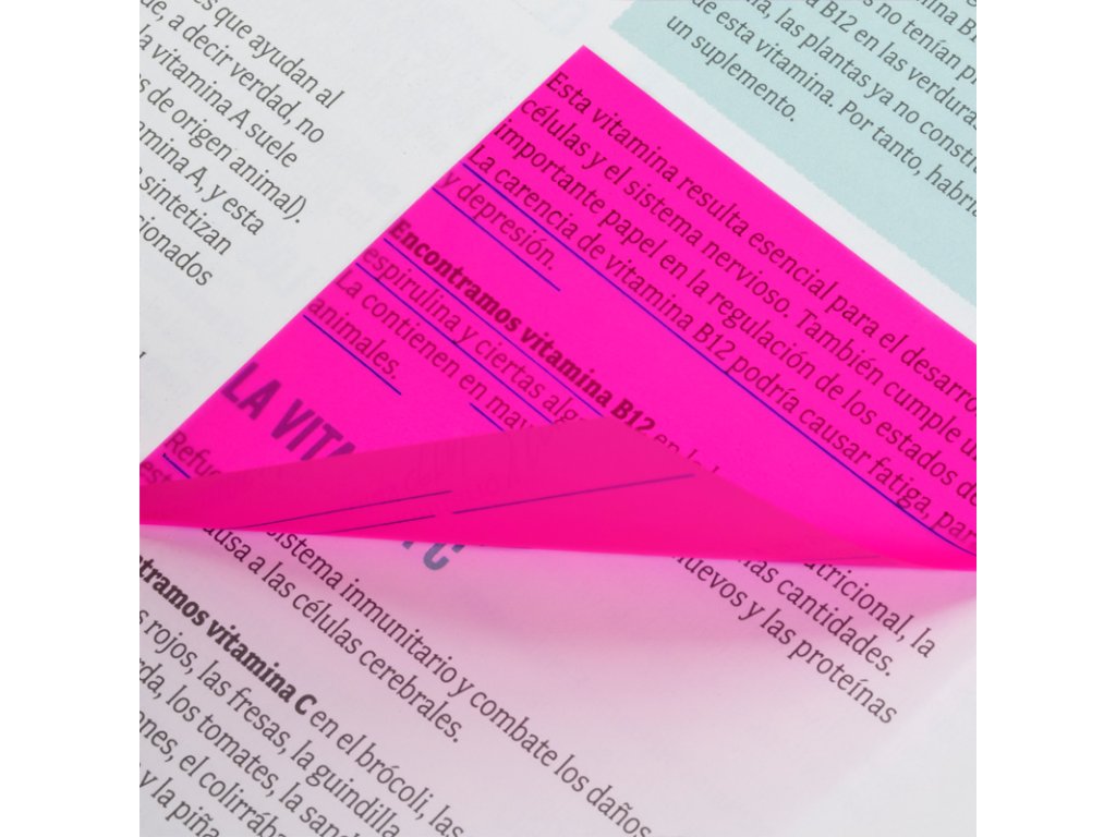 Průhledné a odnímatelné plastové lepící bločky ve 4 Fluo barvách (bílá, žlutá, růžová a oranžová).