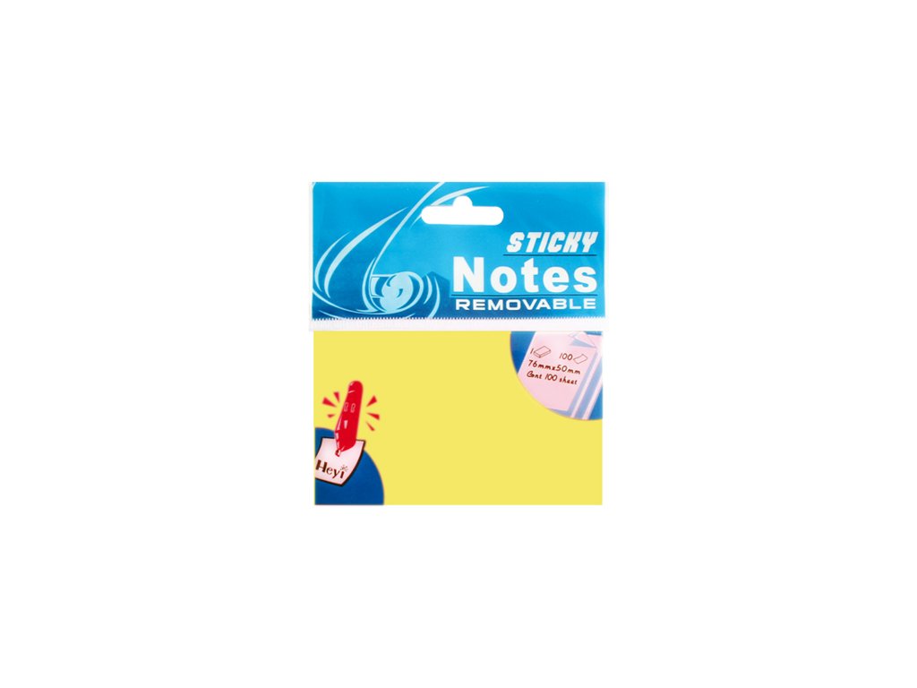 Papírové samolepicí lístky žluté barvy v bloku, rozměr 50 x 76 mm, lepidlo umožňuje opakované použití lístků, pričem nezanechává stopy, blok obsahuje 100 samolepicích lístků.Doplňkové parametry