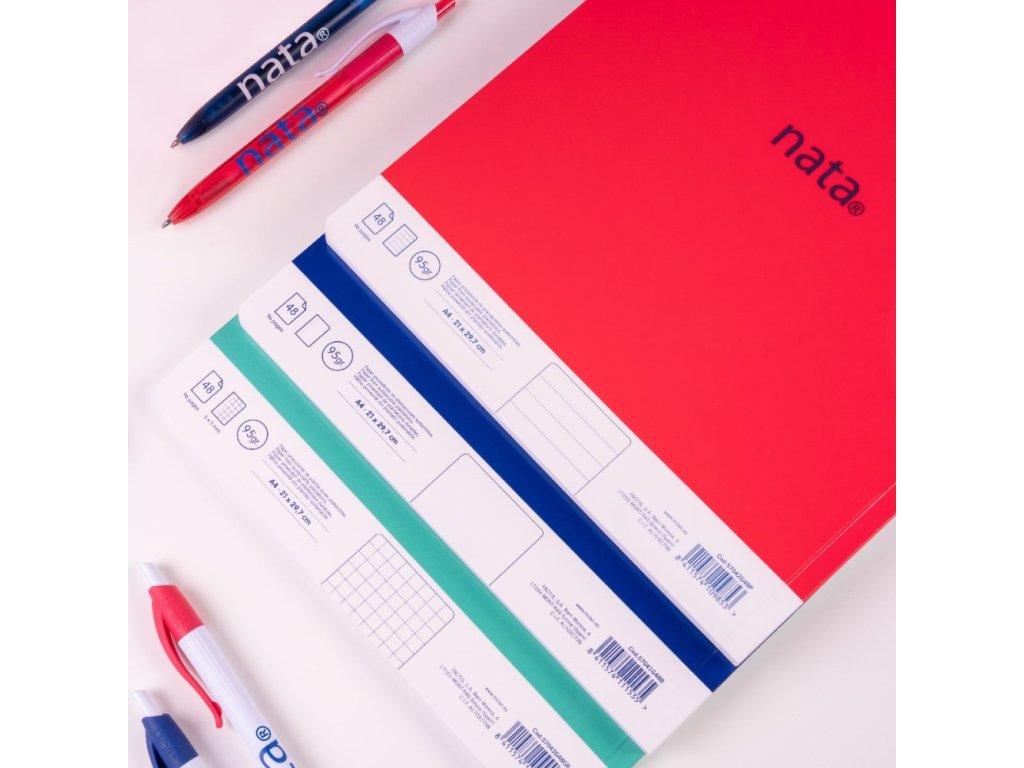Zápisník A4 s lepenou vazbou a pružnými vrchními deskami.