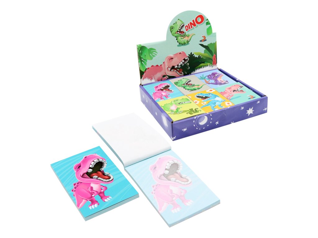 Mini bloček na psaní poznámek s potiskem usmátého dinosaura v pestrých barvách.