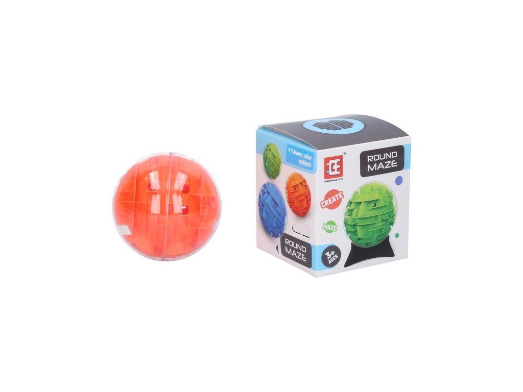 Bludiště 3D kulaté. Velikost 8 cm. Cílem je dostat kuličku do jamky. Když propadne kulička dírou dovnitř, vypadne vždy na startu. Stojánek na kulaté bludiště v balení. více variant. Obrázkové řešení na obalu.Doplňkové parametry