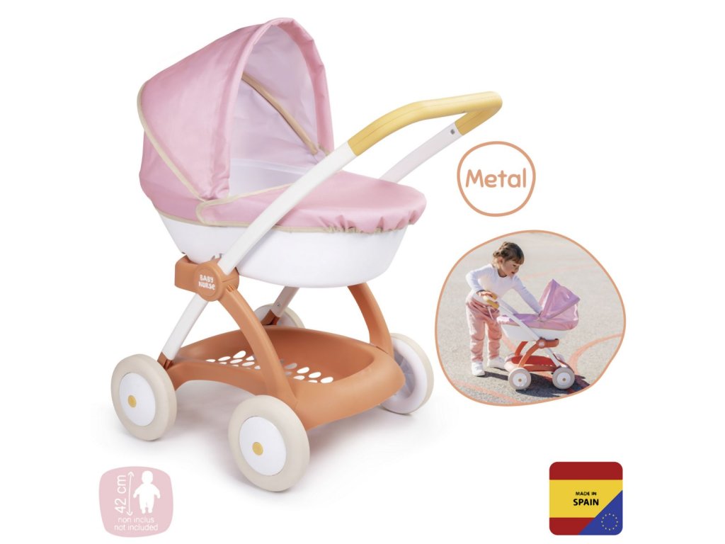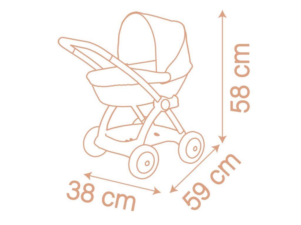 Kočárek Baby Nurse s vysoce kvalitním kovovým rámem a odolnou látkou. Se skládací boudičkou. Kočárek je speciálně navržen pro menší děti od 18 měsíců a je obzvláště robustní a odolný díky kombinovanému kvalitnímu kovoplastovému rámu. Při zatažené obloze lze skládací střechu volitelně složit. Kočárek pro panenky se snadno čistí díky speciální látce: stačí namočit houbičku do trochy vody a jemně otřít. Vhodné pro všechny panenky do 42 cm. Balení bez panenky. Rozměry produktu (DxŠxV): 59 x 38 x 58 cm. Výška rukojeti: 58 cm.Doplňkové parametry