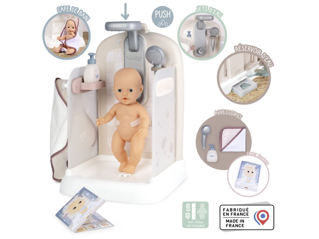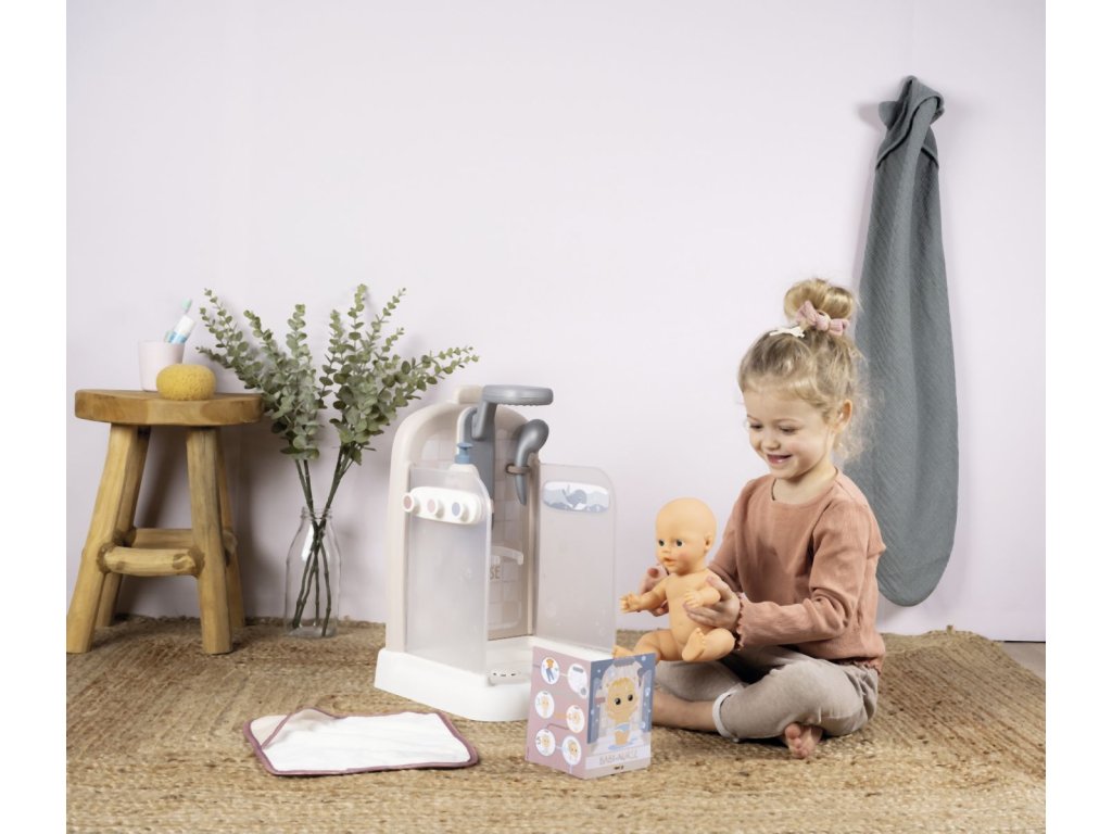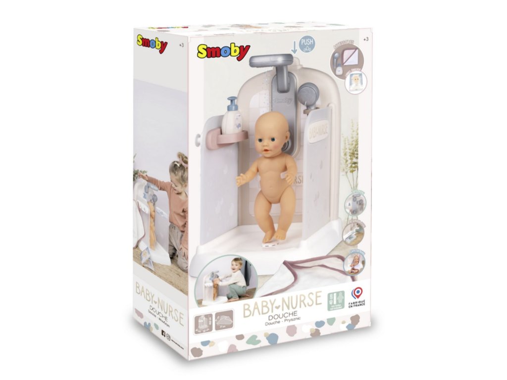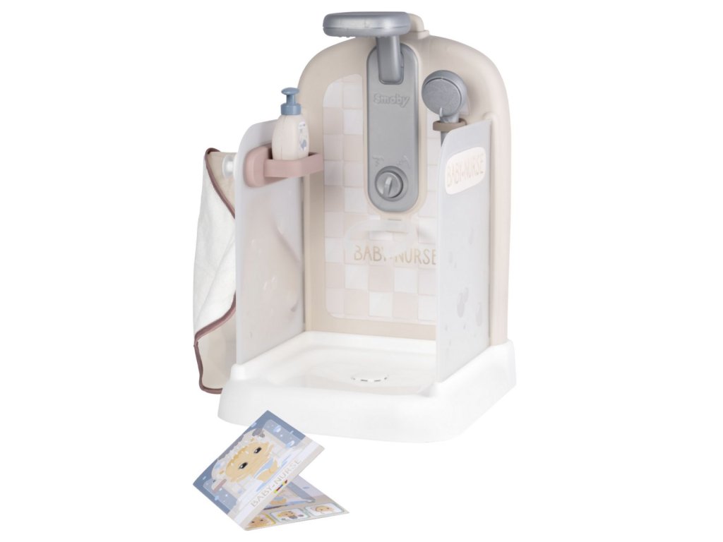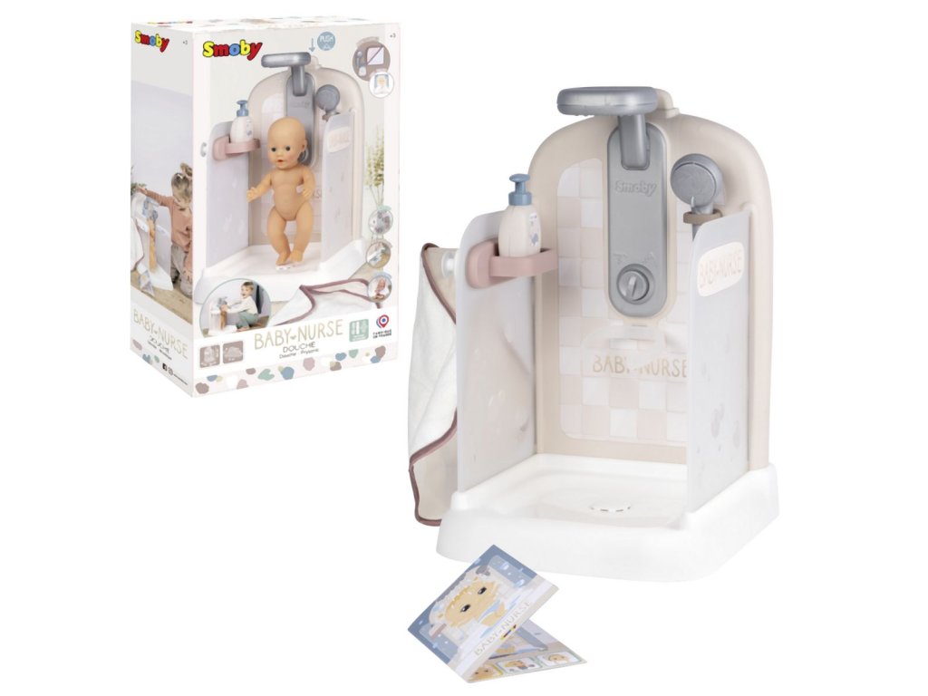 Sprchový kout pro panenky Baby Nurse s funkční sprchovou hlavicí, funkce proudu vody díky čerpadlu a nádrži na vodu. Sprcha má držák na ručník, háčky na župany, poličku, pevnou sprchu, hlavici a řada dalšího příslušenství. Vhodné pro panenky do 40 cm (panenka není součástí balení). Rozměry produktu (DxŠxV): 30,9 x 29,9 x 46,6 cm. Hmotnost 1,845 kg.Doplňkové parametry