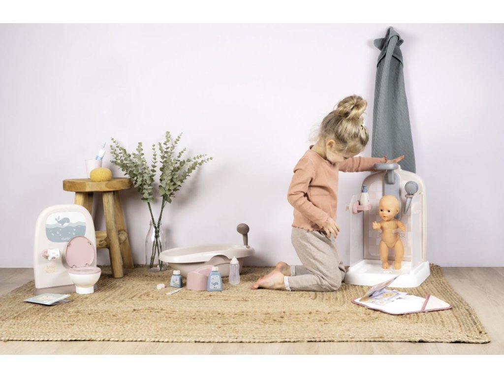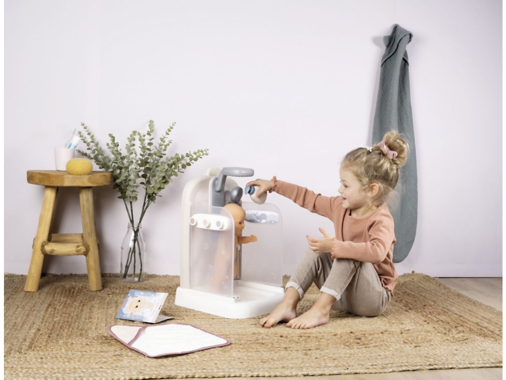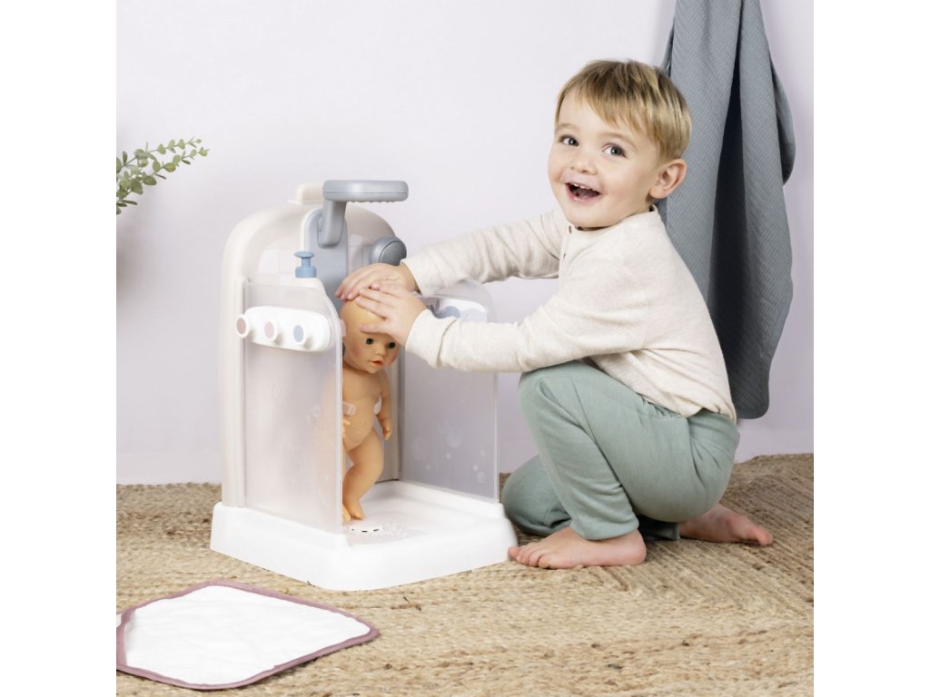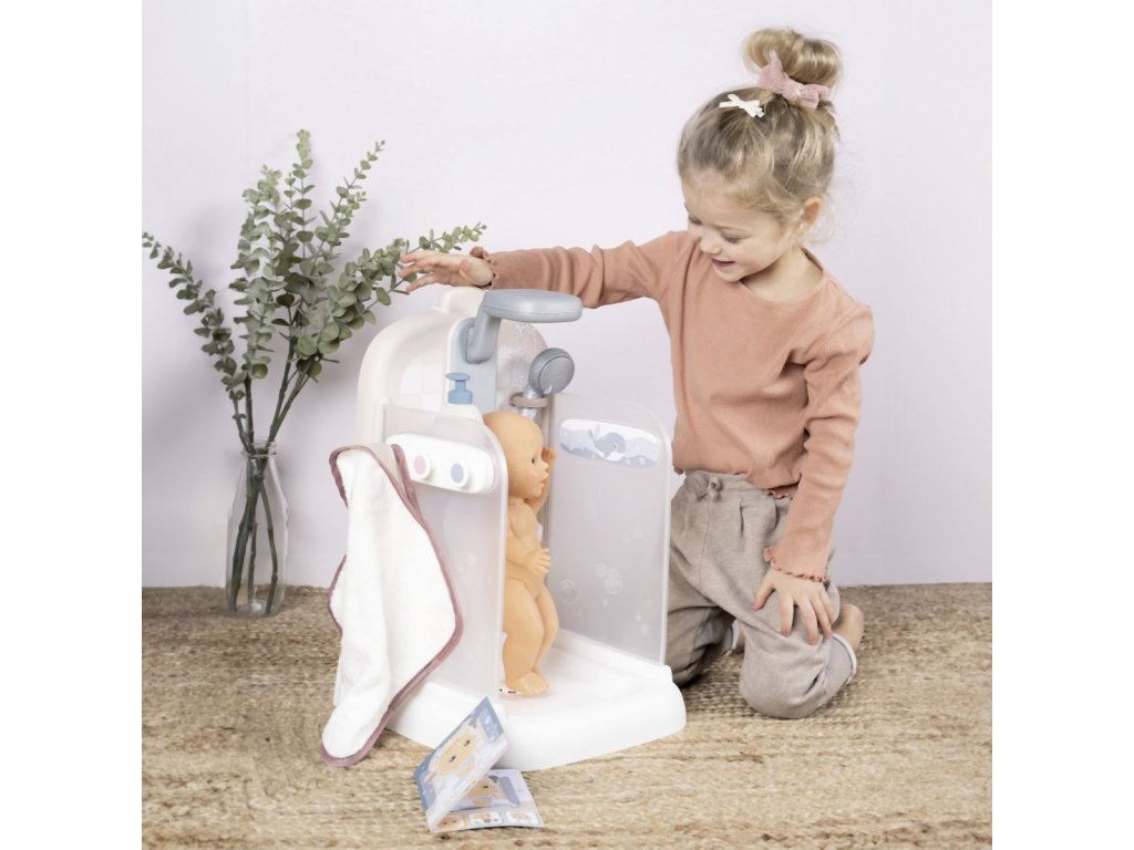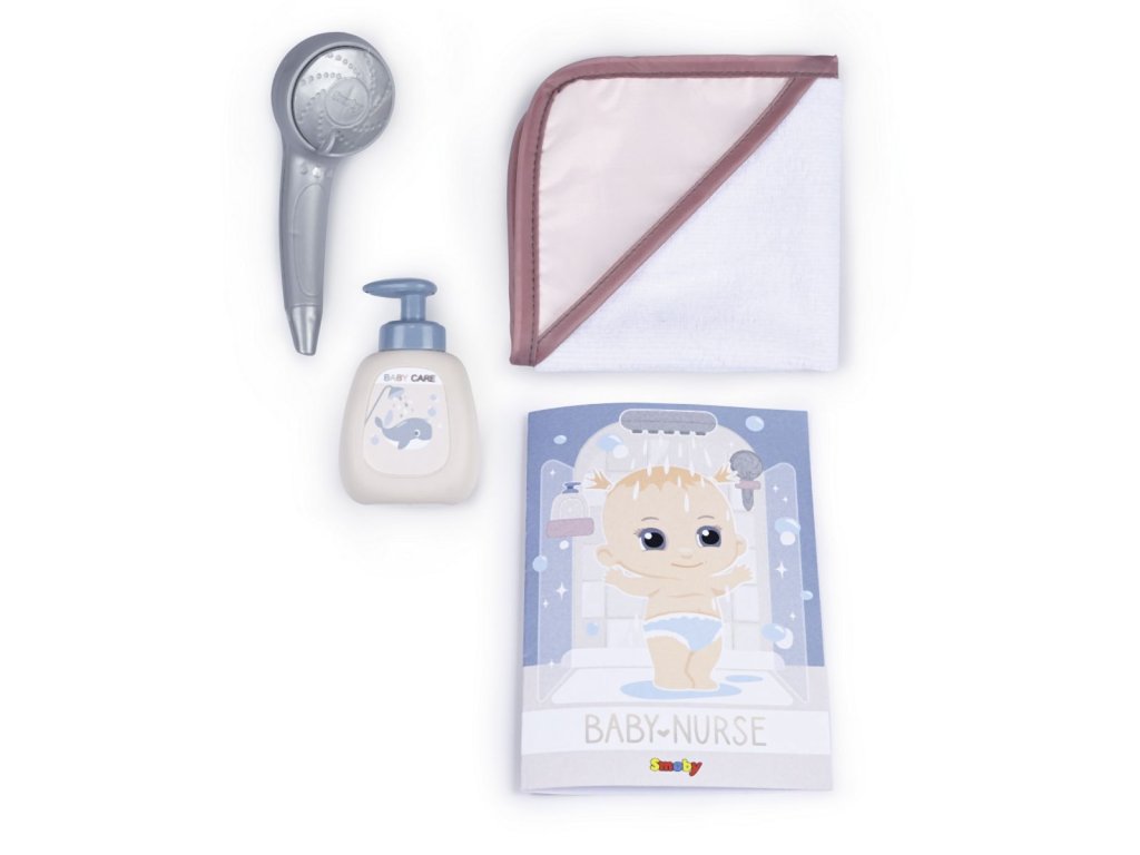 Sprchový kout pro panenky Baby Nurse s funkční sprchovou hlavicí, funkce proudu vody díky čerpadlu a nádrži na vodu. Sprcha má držák na ručník, háčky na župany, poličku, pevnou sprchu, hlavici a řada dalšího příslušenství. Vhodné pro panenky do 40 cm (panenka není součástí balení). Rozměry produktu (DxŠxV): 30,9 x 29,9 x 46,6 cm. Hmotnost 1,845 kg.Doplňkové parametry