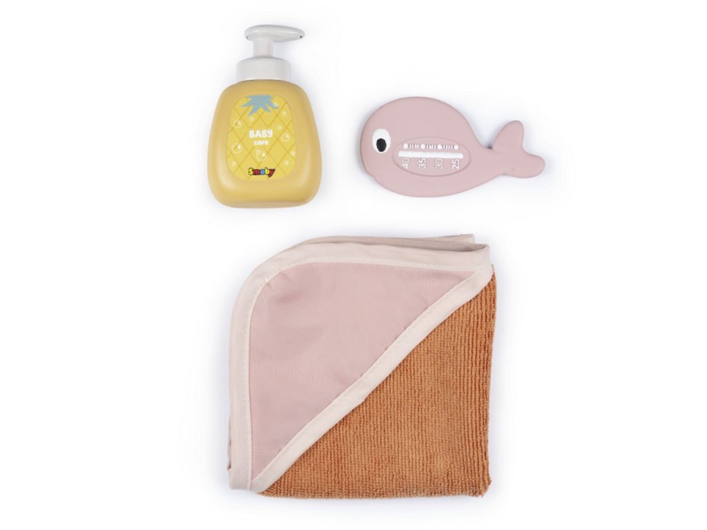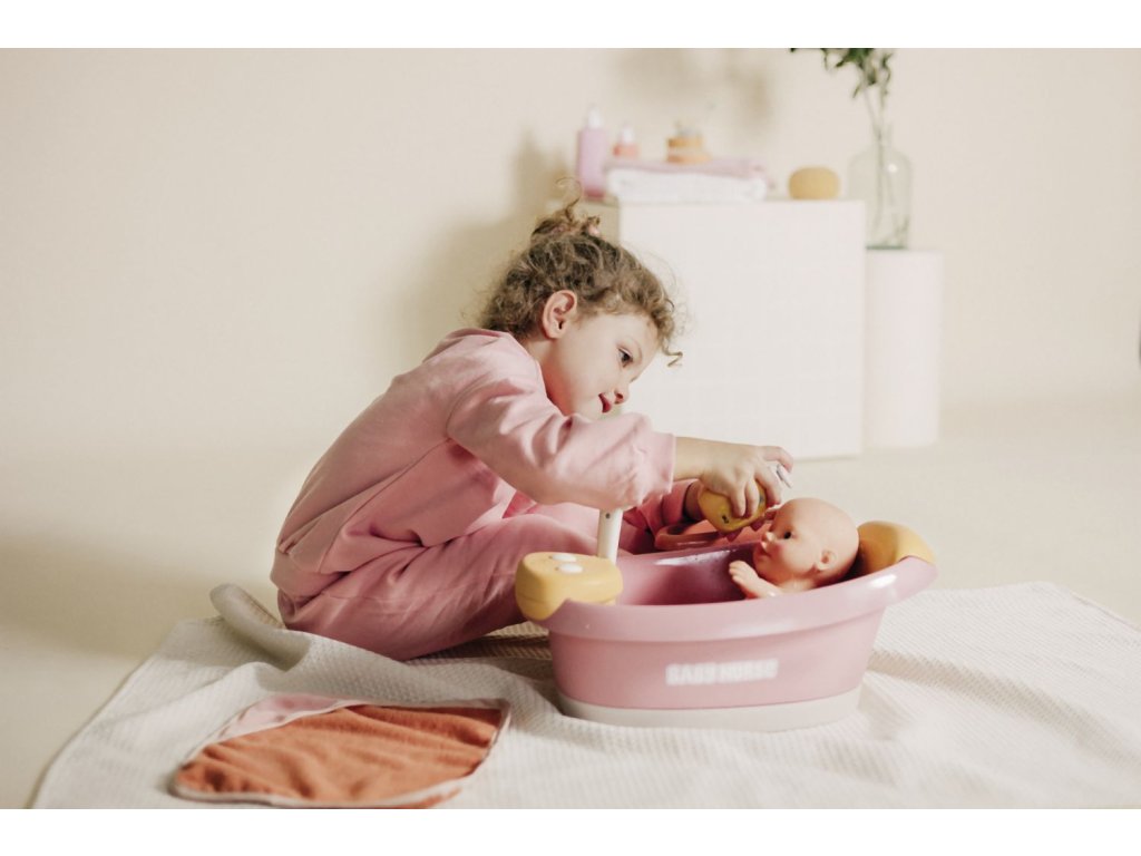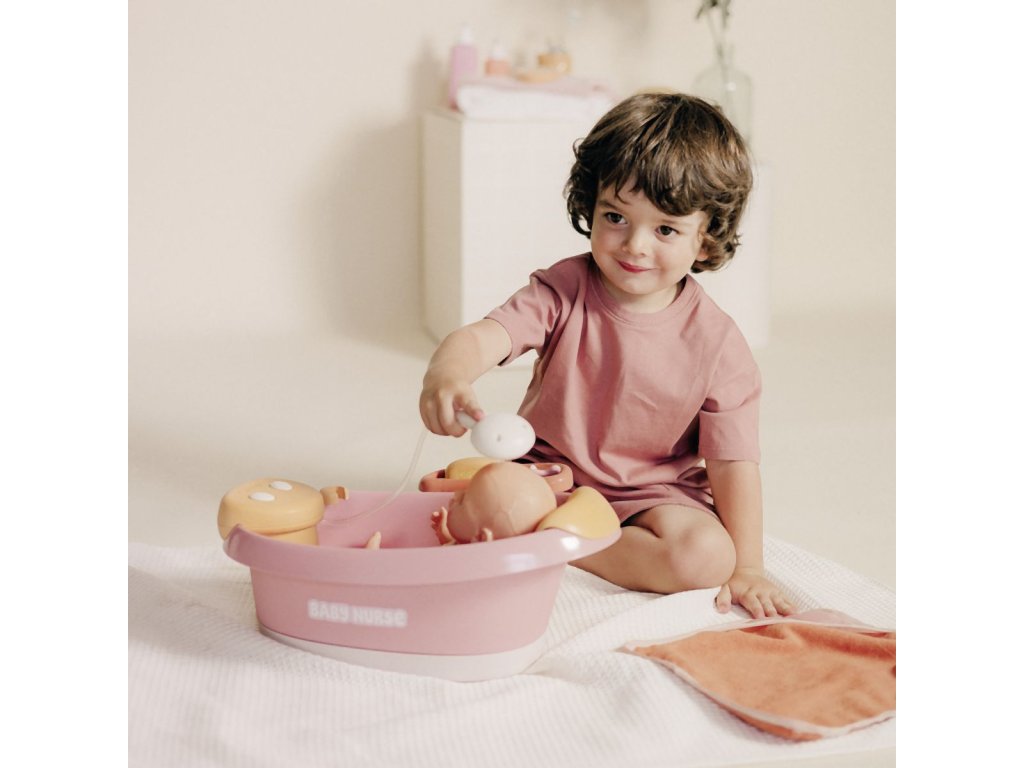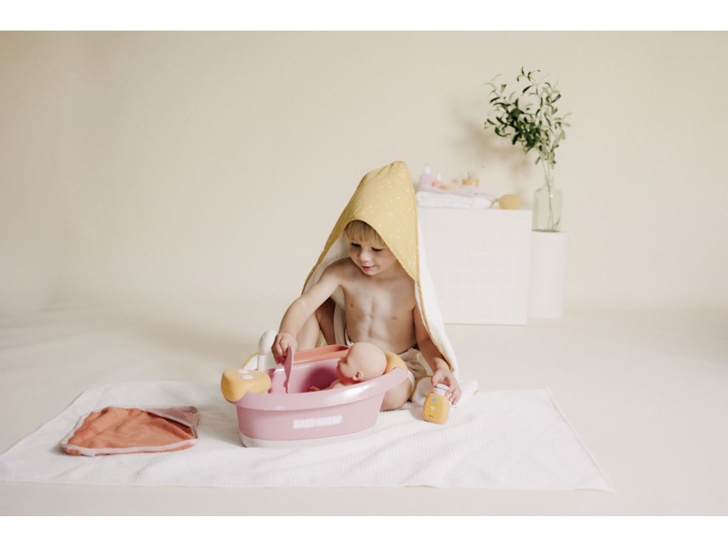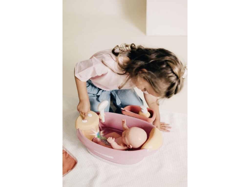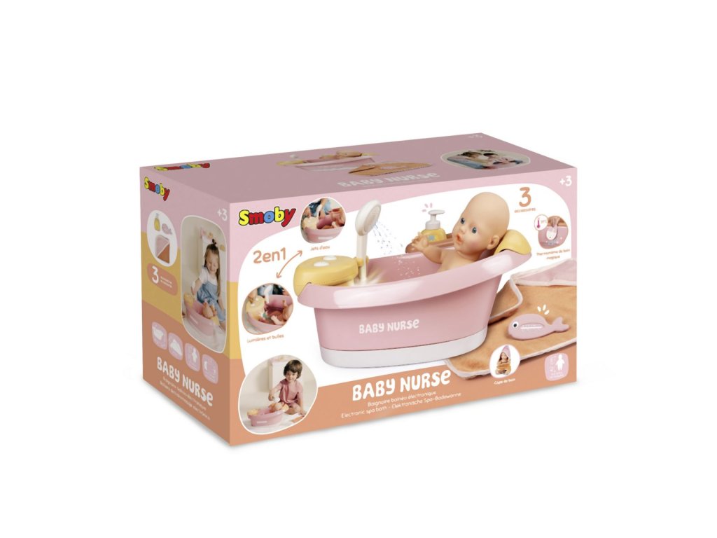 Vanička s opěrkou hlavy pro panenky Smoby Baby Nurse s elektronickou sprchou a bublinkovou funkcí se světlem. Z automatické sprchové hlavice vyteče skutečná voda pouhým stisknutím tlačítka. Vana má elektronický modul se 2 funkcemi: uzavřený okruh vodní trysky a bublifuk se světlem. Polička nabízí dostatek místa pro uložení vloženého příslušenství: osušky z bavlněného froté, lahvičky na šampón s pumpovací funkcí a teploměru ve tvaru velryby. Teploměr je citlivý na teplo, při kontaktu s vodou mění barvu. Vhodné pro panenky do 42 cm. Panenka není součástí balení. Rozměry (DxŠxV): 40 x 30 x 23 cm.Doplňkové parametry