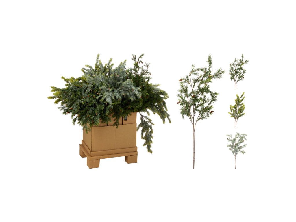 Umělá dekorace - větvička borovice ve třech povrchových úpravách.