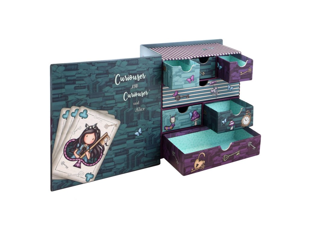 Tento úložný box Curiosity Keepsake má 7 samostatných zásuvek s dostatečným prostorem pro šperky a další maličkosti. Krásně detailní s éterickým smaragdovým znakem Curiosity a ikonami. Podrobný popis: 7 zásuvek Spona na pásku materiál: karton rozměry: 23 x 23 x 9 cm Obchodní informace: výrobce: Santoro London kolekce: Gorjuss motiv: Curiosit dovozce: Reas-Pack s.r.o.Doplňkové parametry