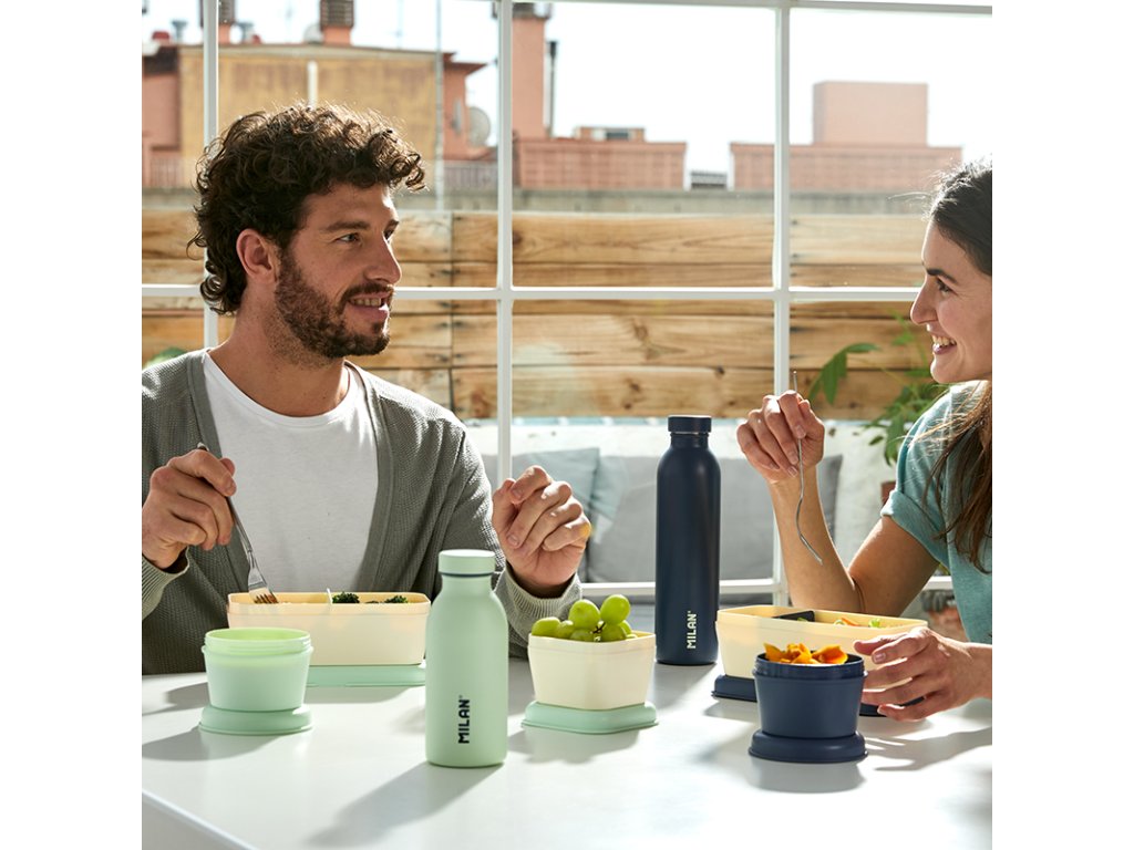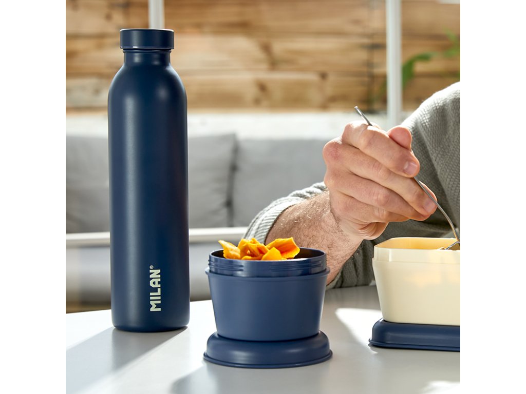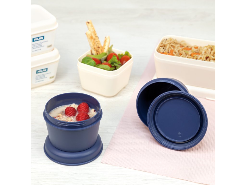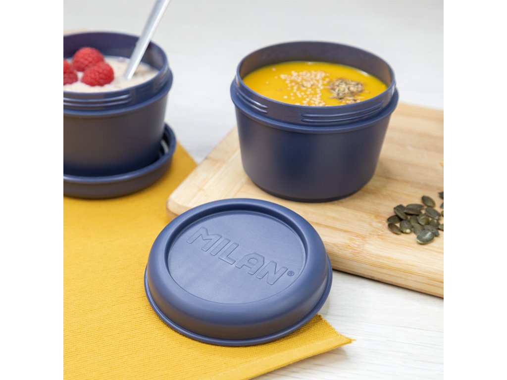 Hermetická kulatá krabička na oběd, modrá barva. Šroubovací víko, které poskytuje hermetické uzavření. Vhodné pro ohřev v mikrovlnné troubě (max. 70 ° C) s otevřeným víkem na uvolnění páry. Vhodné pro uskladnění v mrazničce (do -20 ° C). Vhodný pro mytí v myčce nádobí (max. 70 ° C). Víčka a nádoby se dají snadno složit k sobě. Matný vnější povrch pro lepší úchop. Uvnitř s lesklým povrchem pro lepší čištění. Materiál: plast bez BPA. Rozměry: 10 O x 7 cm. Objem: 0,25 litru.Doplňkové parametry