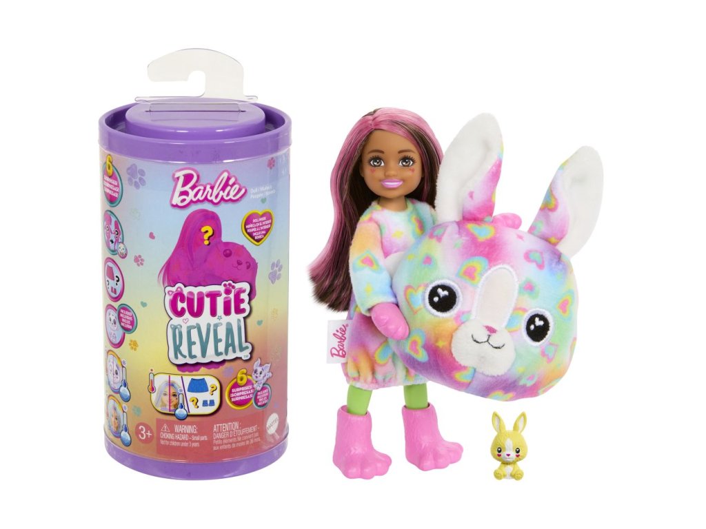 Panenky Barbie® Cutie Reveal™ Chelsea™ barevné sny nabízejí ten nejrozkošnější zážitek z rozbalování a 6 překvapení! Kterou panenku odhalíte? Ve hře je zajíček, zebra, tučňák nebo dalmatin - proměněný z černobílého do snového duhového kožíšku. Po sundání plyšového kostýmu odhalíte panenku Chelsea™ a objevíte další překvapení jako sukýnku a mini zvířátko, které ladí s kostýmem panenky. Otočením plyšového kostýmu získáte oversized kabátek a z hlavičky kostýmu zase pelíšek pro domácího mazlíčka.Doplňkové parametry