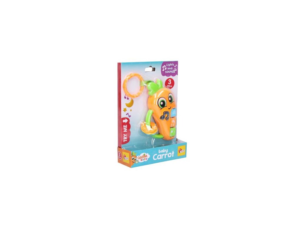 Carotina mrkvička s efekty. Velikost 16 cm. 3 tlačítka se zvířátky - opakované stisknutí střídá melodii a zvuk zvířátka. Tlačítko s notou spouští 2 různé melodie a bliká. Kroužek na zavěšení. Baterie 3xAG13 součástí.Doplňkové parametry