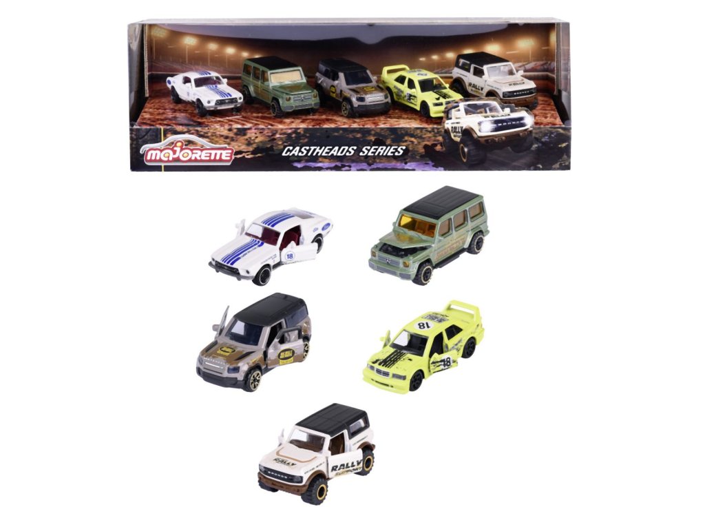 Dárková sada kovových autíček z kolekce CastHeads Series na volnoběh. Balení obsahuje 5 ks: Ford Mustang Fastback, Ford Bronco Wildtrak, Land Rover Defender 90, Mercedes-Benz 190E 2.5-16, Mercedes-Benz G 500. Délka autíčka 7,5 cm. V měřítku 1:64.Doplňkové parametry