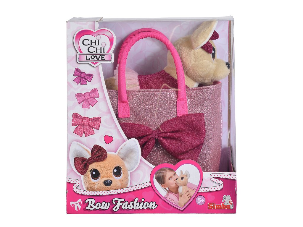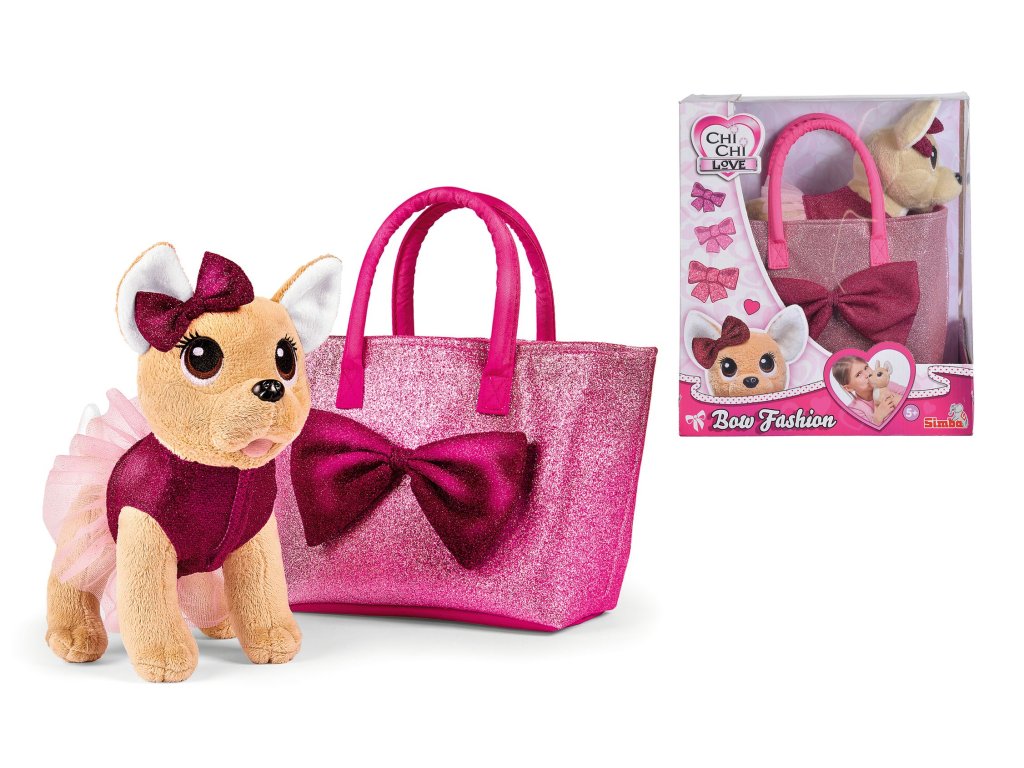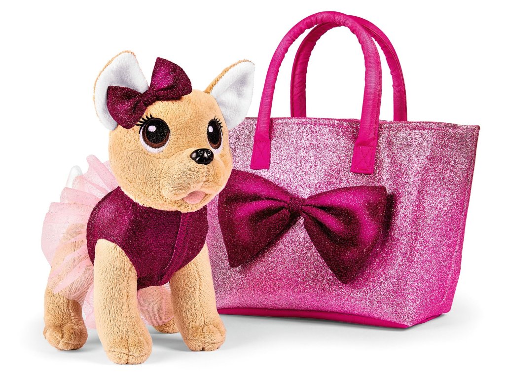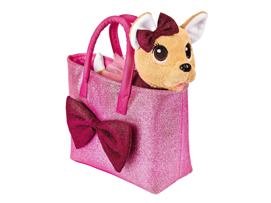 Plyšový pejsek čivava s mašlí v růžovém třpytivém oblečku s taškou s mašlí. Velikost 20 cm.Doplňkové parametry