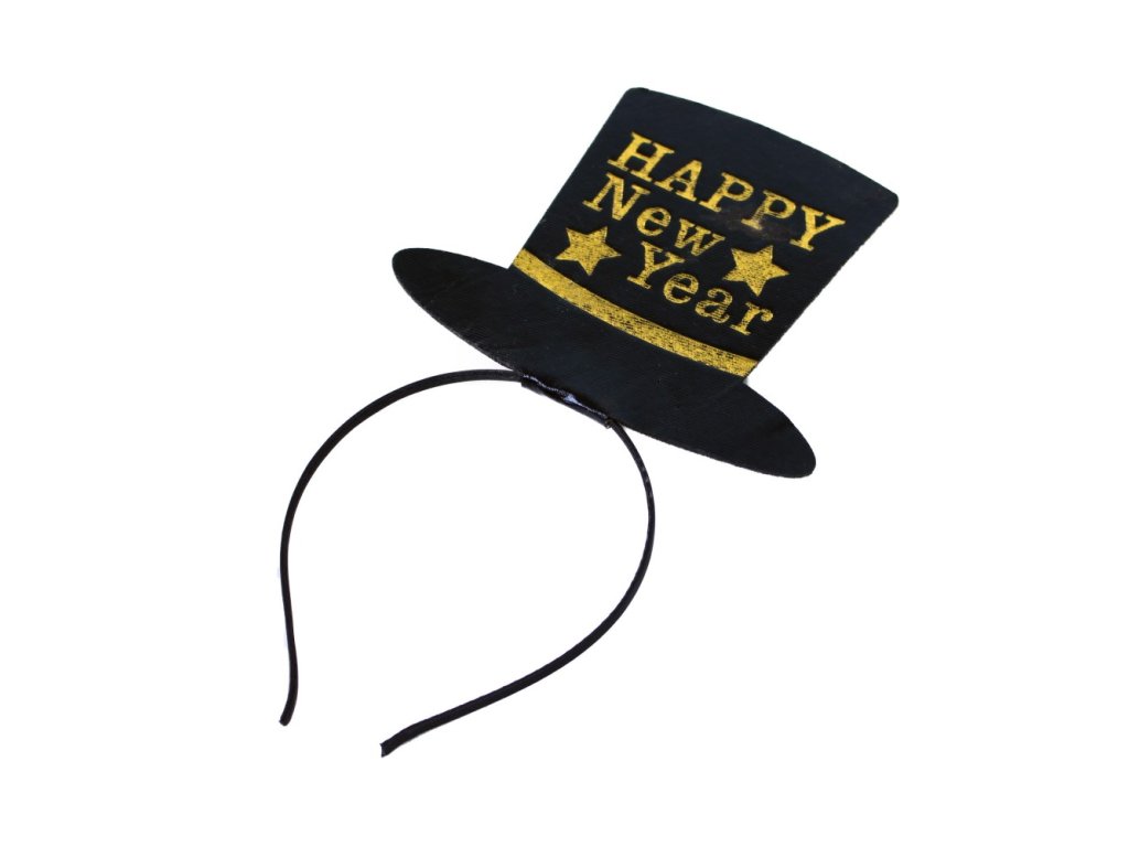 Černá čelenka s kloboučkem, doplněná zlatým nápisem HAPPY New Year je senzačním doplňkem na oslavu nebo večírek při vítání Nového roku!Doplňkové parametry