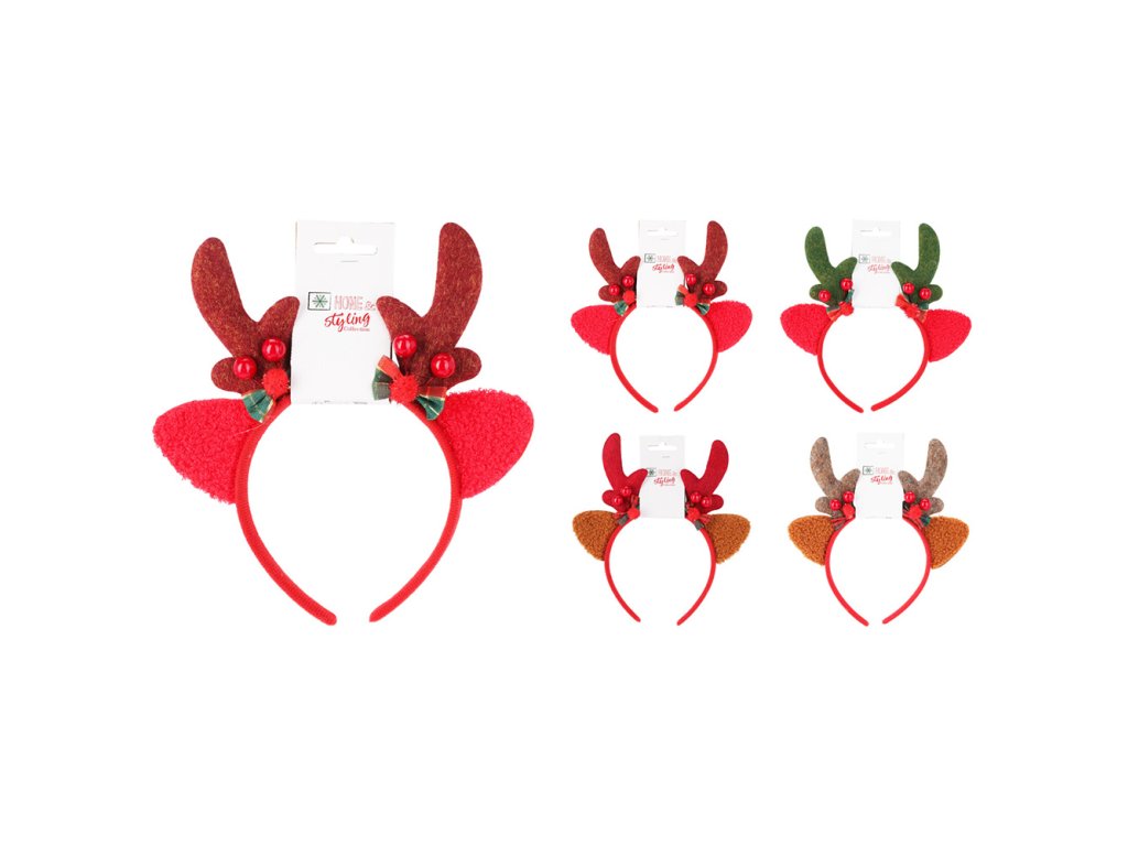 Čelenka dětská, vánoční sob s parohy zdobenými rolničkami a mašlí (mix 4 barev)