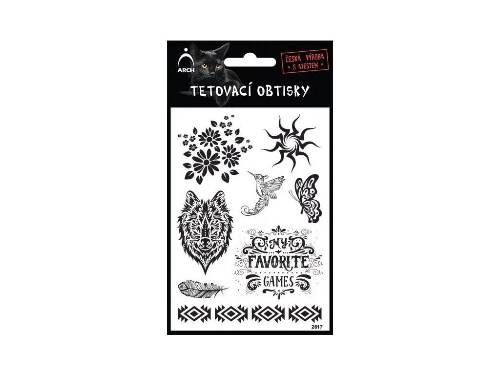 Černé tetovací obtisky - kvítí. Rozměr: 10 x 17 cm. Návod: Vystřihněte zvolený motiv a odstraňte krycí fólii. Obrázek přitiskněte na čistou a suchou pokožku. Shora vodou navhlčete 20 sekund papírovou podložku obrázku a opatrně ji odstraňte. Obrázek nechejte 60 sekund zaschnout. Tetování lze odstranit pomocí lihu, krému, běžným mytím nebo dětským olejíčkem. Cena za jeden kus.Doplňkové parametry