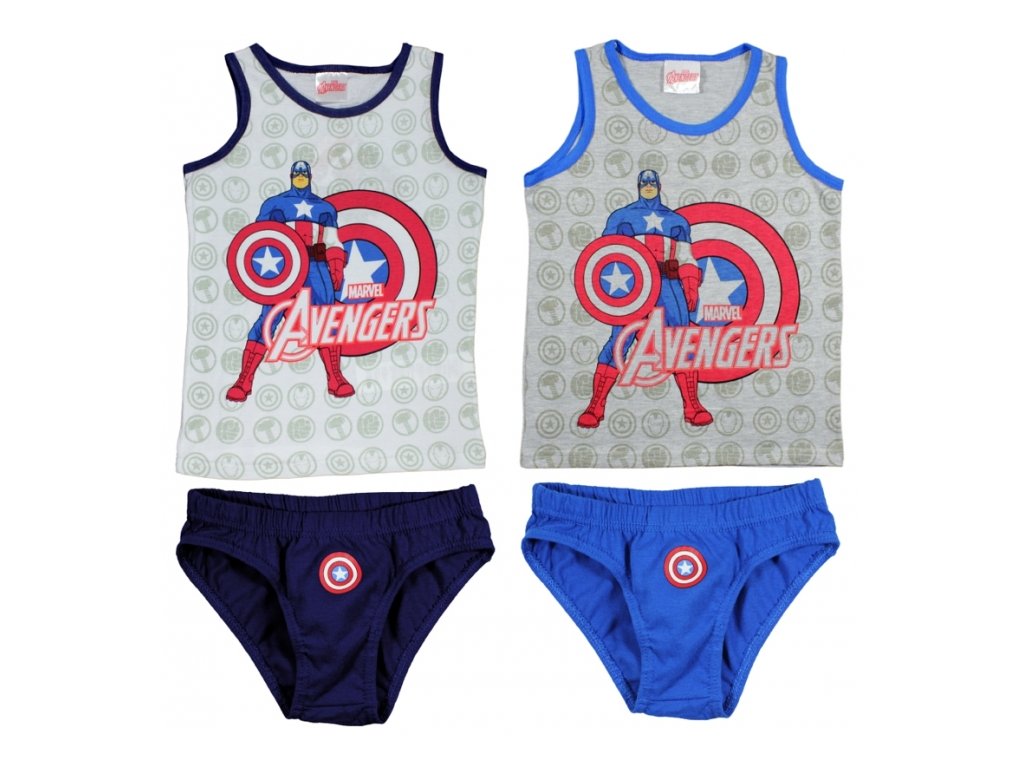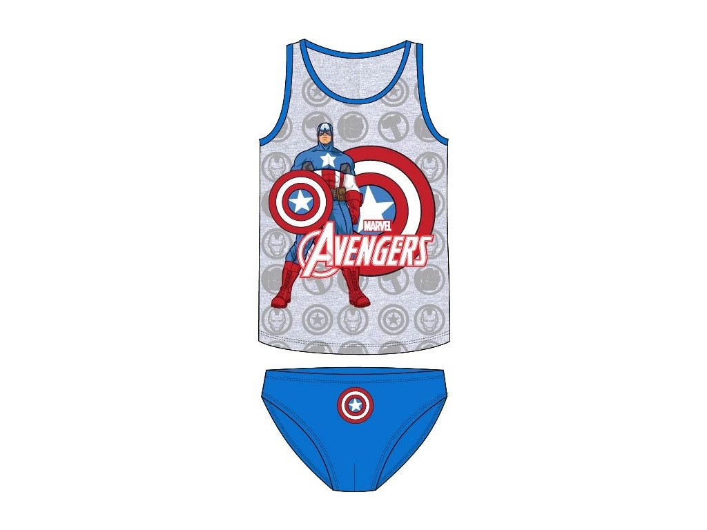 Chlapecká souprava spodního prádla s oblíbeným motivem hrdiny Avengers, tílko a slipy, materiál: 100% bavlna, 135 gsm, barva světle modrá v kombinaci s šedou a barevným potiskem, velikosti:104/110 - 4/5 let