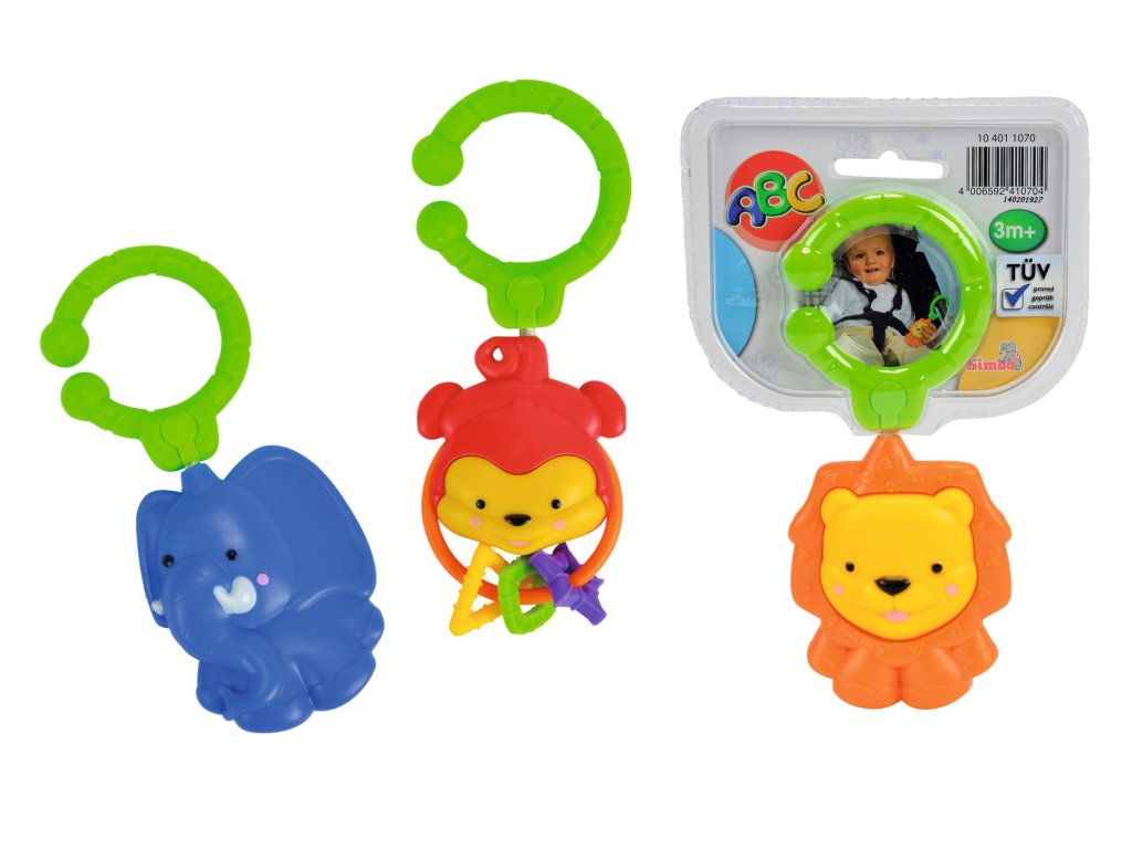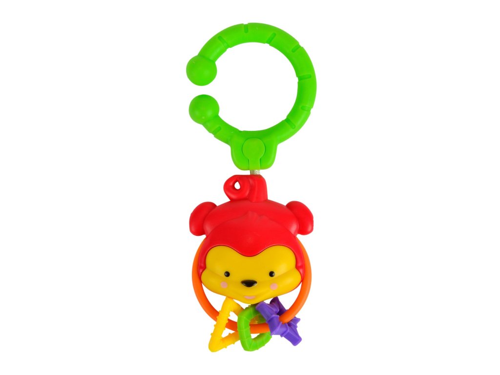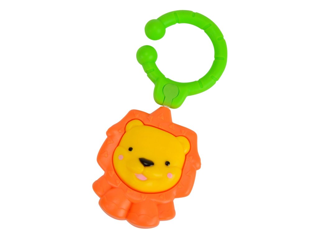 Chrastítko s klipsou pro uchycení např. na pás autosedačky. Velikost 8 cm. 3 druhy: lev, slon nebo opička.Doplňkové parametry
