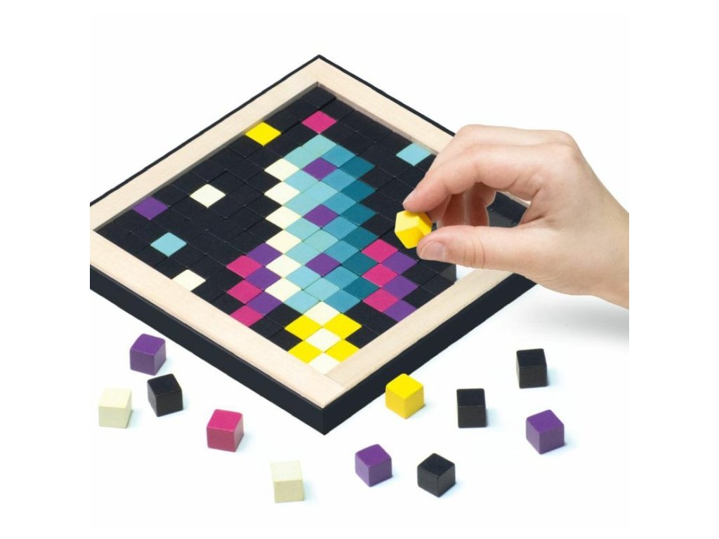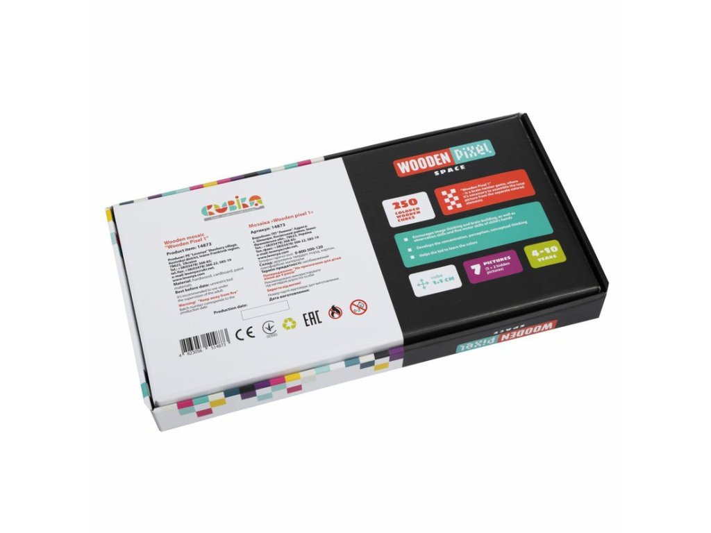 CUBIKA je nová značka dřevěných hraček vyrobených pouze z ekologicky pěstovaného dřeva s velmi precizním opracováním a líbivým designem. Pixel I vesmír je dřevěná mozaika s 250 kostičkami o velikosti 1 x 1 cm, 7 tematickými předlohami a dřevěným rámečkem. Znalost barev a špetka trpělivosti postačí k tomu, aby se podařilo z jednotlivých barevných kostiček poskládat krásné obrázky. Sortiment hraček značky CUBIKA pomáhá dětem rozvíjet především senzomotorické schopnosti a dovednosti, logické myšlení, kreativitu, představivost a různé poznávací znalosti. Hračky jsou vyrobeny z nejkvalitnějšího javoru a buku a k barvení se používají též vysoce kvalitní barvy na vodní bázi, které jsou naprosto bezpečné pro děti a nemají žádný zápach. Všechny výrobky této značky mají německý certifikát TÜV a jsou vyrobeny dle evropské normy pro bezpečnost hraček EN 71. Nevhodné pro děti do 4 let. Vyrobeno v Evropě.Doplňkové parametry