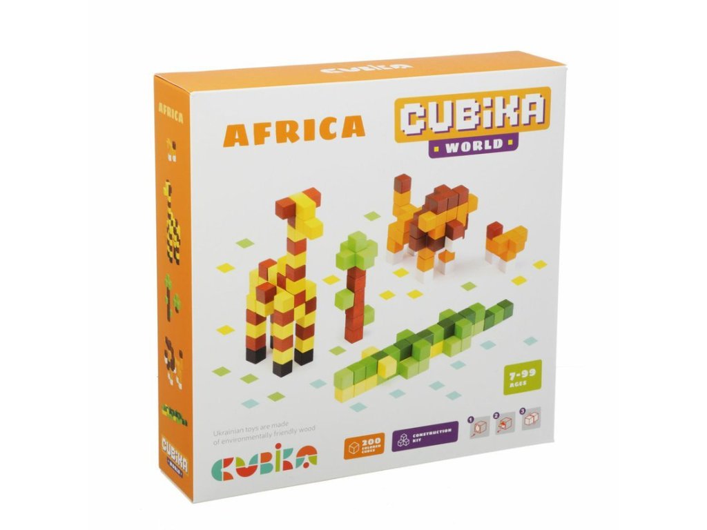 CUBIKA je nová značka dřevěných hraček vyrobených pouze z ekologicky pěstovaného dřeva s velmi precizním opracováním a líbivým designem. Pixel "Afrika" - dřevěná 3D stavebnice 200 kostiček je tematická kreativní sada, která umožňuje z kostiček o velikosti 1 x 1 cm poskládat vyobrazený motiv na krabici. Jednotlivé barevné kostičky se k sobě lepí pomocí malých oboustranných lepících koleček dle přiloženého návodu. Sortiment hraček značky CUBIKA pomáhá dětem rozvíjet především senzomotorické schopnosti a dovednosti, logické myšlení, kreativitu, představivost a různé poznávací znalosti. Hračky jsou vyrobeny z nejkvalitnějšího javoru a buku a k barvení se používají též vysoce kvalitní barvy na vodní bázi, které jsou naprosto bezpečné pro děti a nemají žádný zápach. Všechny výrobky této značky mají německý certifikát TÜV a jsou vyrobeny dle evropské normy pro bezpečnost hraček EN 71. Nevhodné pro děti do 7 let. Vyrobeno v Evropě.Doplňkové parametry