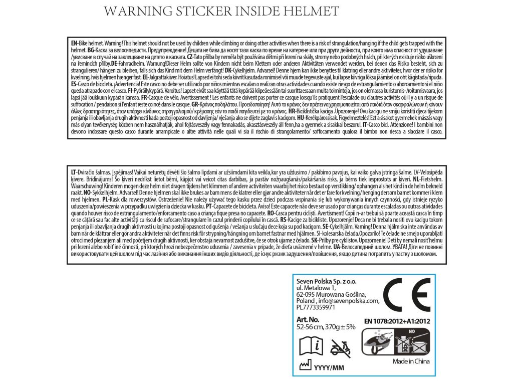 Helma je doporučena pro děti při jízdě na kole, bruslích, koloběžkách atd. Vnější helma je vyrobena z PVC a zdobena postavičkami z Tlapkové patroly, vnitřek je vyroben z EPS pěny absorbující nárazy. Helma je vybavena nastavovacím knoflíkem pro přizpůsobení helmy hlavičce dítěte, popruhy na obou stranách přichycené pod bradou přezkou s měkkou podložkou. Ve skořepině helmy je 12 větracích otvorů. Přilba splňuje normu EN 1078:2012+A1. Hmotnost 180 gr. Obvod hlavy 48-52 cm. Technický popis: vysoce kvalitní materiály s vysokým standardem bezpečnosti technicky propracovaný tvar větrací otvory zajišťujících odvětrávání oblasti hlavy atraktivní design a motiv Tlapkové patroly materiál: plastová skořepina, tvrzená pěna velikost: 48-52 cm nastavení kolečkem určená pro jízdu na kole, kolečkových bruslích, skateboardu či freeride testována dle normy TUV-GS a CE1078 Certifikace je součástí helmy. Toto označení CE slouží zákazníkům a uživatelům jako vyjádření shody se základními požadavky nařízení vlády, resp. Evropské směrnice. Varování! Tuto přilbu by děti neměly používat při lezení nebo jiných činnostech, kdy hrozí riziko uškrcení - zavěšení, pokud by se dítě o přilbu zachytilo. Výrobce: Seven. Seven Polska Sp. z o.o., ul. Metalowa 1, 62-095 Murowana Goślina, Poland, info@sevenpolska.com, PL7773359971Doplňkové parametry