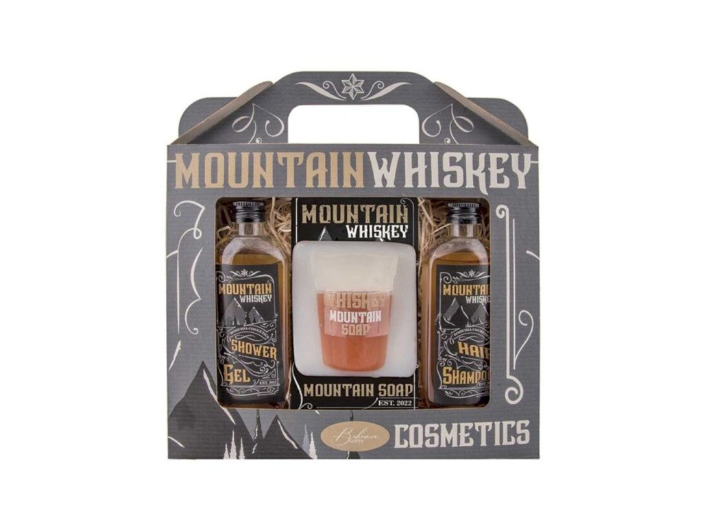 Dárkové balení kosmetiky Whiskey Mountain SPA. Sprchový gel 100 ml, ručně vyráběné tvarované mýdlo 70 g a vlasový šampon 100 ml. Kosmetická sada pro muže i dámy.Doplňkové parametry