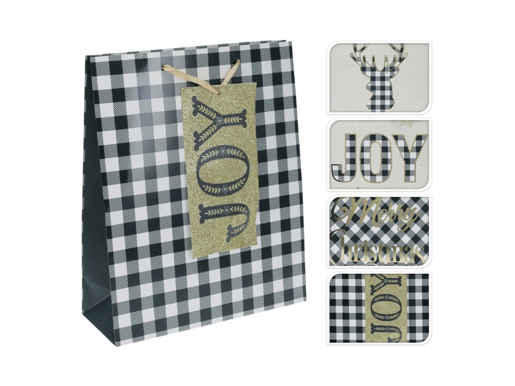 Vánoční dárková taška ve 4 černo-bílých motivech střední velikosti. - embosovaný vzor hořkou ražbou - ouško ze zlatého saténu Cena je za 1 kus. Materiál: papír 210g/m2Doplňkové parametry