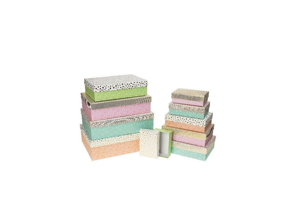Sada dárkových krabic. Rozměry: 14,5 x 10 x 5 cm; 17 x 12 x 5,5 cm; 9 x 13,5 x 6 cm; 22 x 16 x 6,5 cm; 24,5 x 17,5 x 7 cm; 27,5 x 19,5 x 7,5 cm; 29 x 21 x 8 cm; 33 x 23.5 x 9 cm; 35 x 25 x 10 cm; 37 x 27 x 13 cmDoplňkové parametry