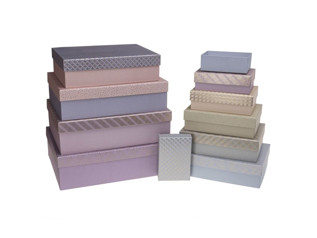 Sada dárkových krabic. Rozměry: 14,5 x 10 x 5 cm; 17 x 12 x 5,5 cm; 9 x 13,5 x 6 cm; 22 x 16 x 6,5 cm; 24,5 x 17,5 x 7 cm; 27,5 x 19,5 x 7,5 cm; 29 x 21 x 8 cm; 33 x 23.5 x 9 cm; 35 x 25 x 10 cm; 37 x 27 x 13 cmDoplňkové parametry