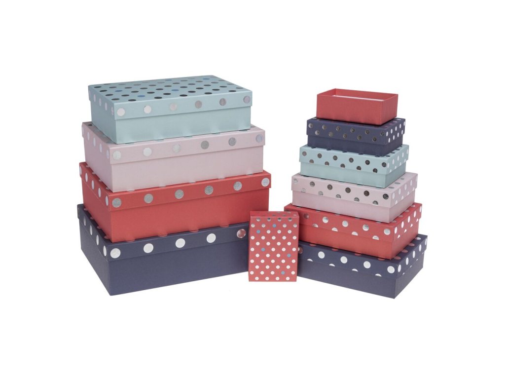 Sada dárkových krabic. Rozměry: 14,5 x 10 x 5 cm; 17 x 12 x 5,5 cm; 9 x 13,5 x 6 cm; 22 x 16 x 6,5 cm; 24,5 x 17,5 x 7 cm; 27,5 x 19,5 x 7,5 cm; 29 x 21 x 8 cm; 33 x 23.5 x 9 cm; 35 x 25 x 10 cm; 37 x 27 x 13 cmDoplňkové parametry