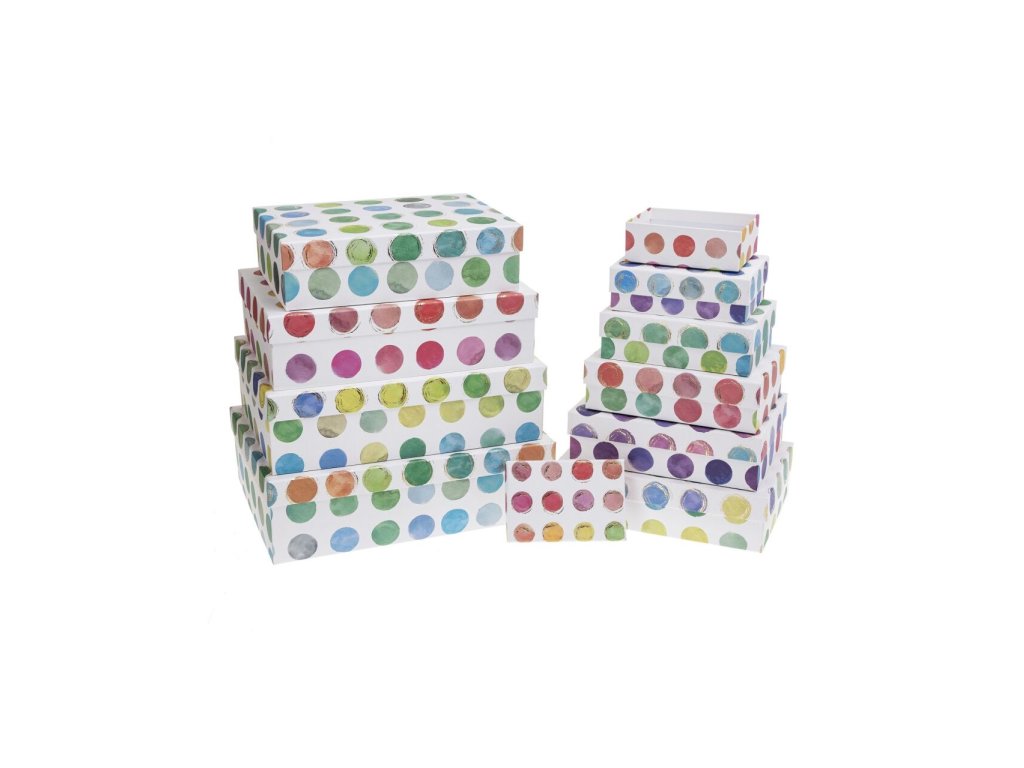 Sada dárkových krabic. Rozměry: 14,5 x 10 x 5 cm; 17 x 12 x 5,5 cm; 9 x 13,5 x 6 cm; 22 x 16 x 6,5 cm; 24,5 x 17,5 x 7 cm; 27,5 x 19,5 x 7,5 cm; 29 x 21 x 8 cm; 33 x 23.5 x 9 cm; 35 x 25 x 10 cm; 37 x 27 x 13 cmDoplňkové parametry