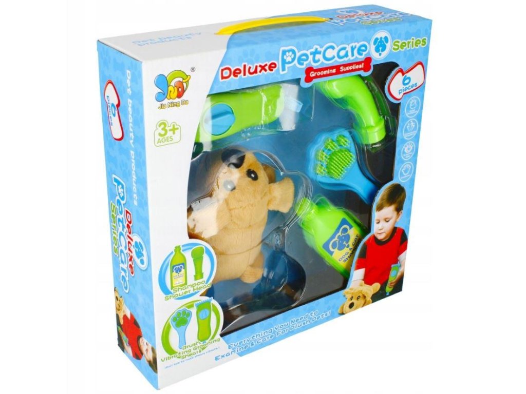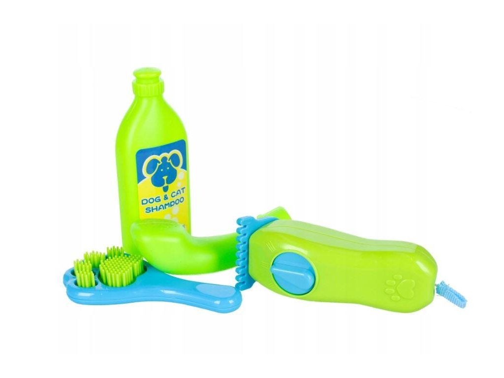 Sada pro kosmetické ošetření psů. Obsahuje veškeré potřebné příslušenství pro úpravu srsti, strojek při natažení vibruje. Součástí sady je plyšový pejsek, zastřihavač srsti, šampon do koupele, kartáč, sprchu. Rozměry: pes 18x6x15 cm, balení: 32x32x9 cm. Pro děti od 3 let. Výrobce: Mega Creative.Doplňkové parametry