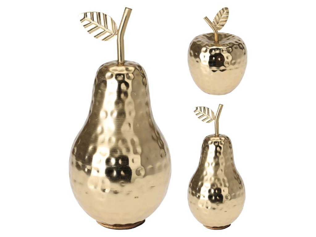 Dekorace jablko, hruška 15 cm, zlatá barva, hliník