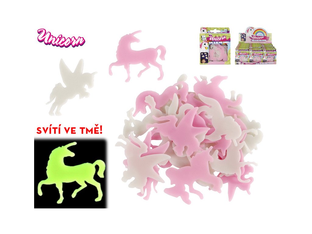 Vyzdob si pokojíček svítícími jednorožci! Stačí nalepit poblíž zdroje světla, nechat nasvítit a ve tmě budou zářit! Fosforeskuje. Balení obsahuje 24ks jednorožců, v bílé a růžové barvě. Materiál: plastObsah balení: 24 ks Cena je uvedena za 1 balení Pro děti od 3 letDoplňkové parametry