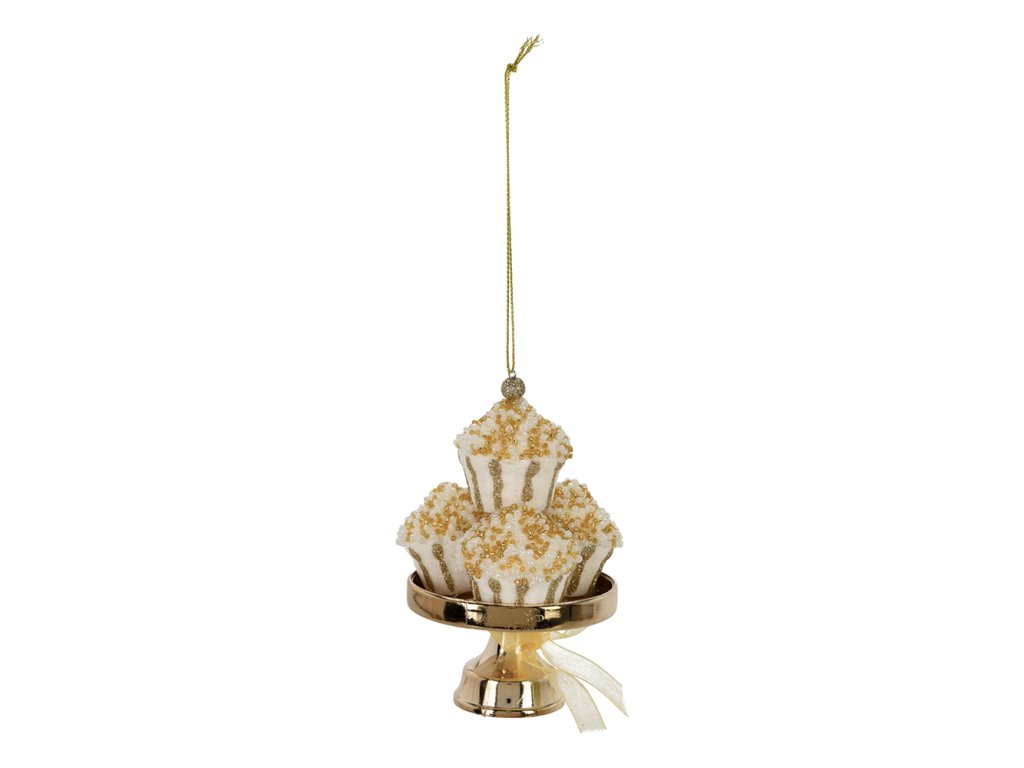 Dekorace - třpytivé mufiny na zlatém podnosu se stuhou a zlatou šňůrkou na zavěšení.