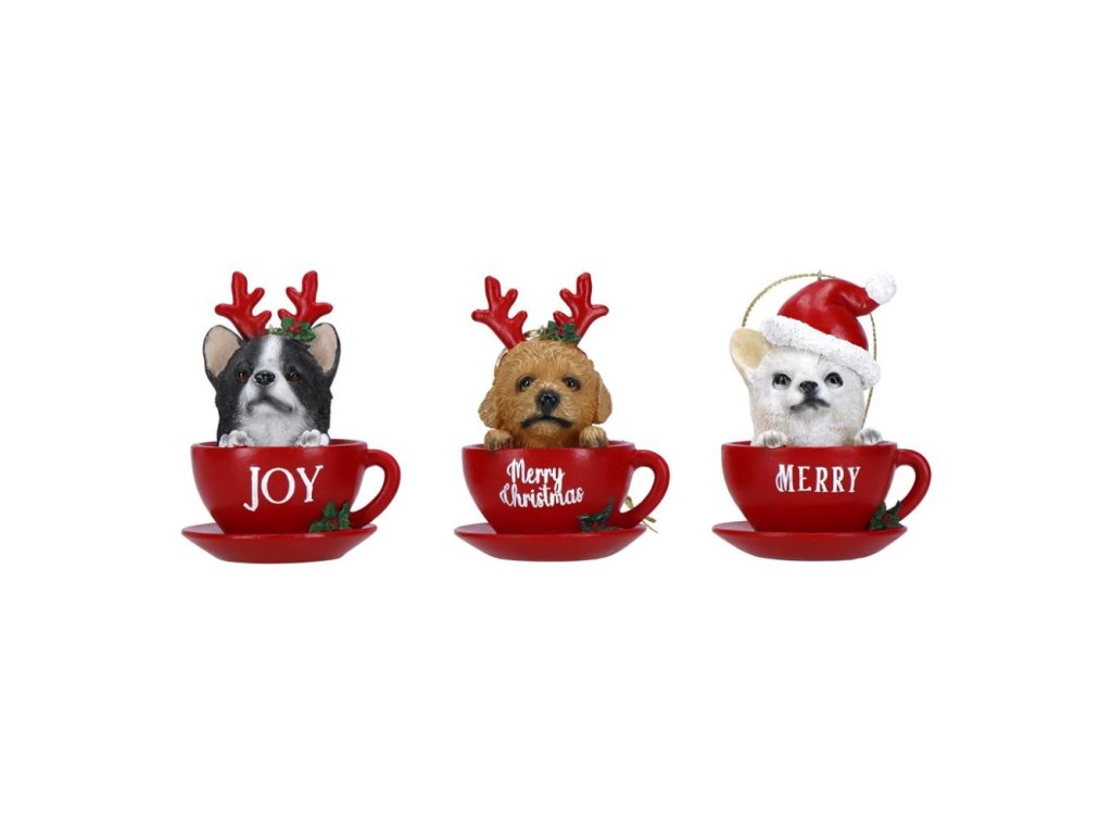 Pejsek ve vánočním převleku sedící v červeném šálku - 3 varianty. Barva: červená Hmotnost: Cena je za 1 kus.Doplňkové parametry