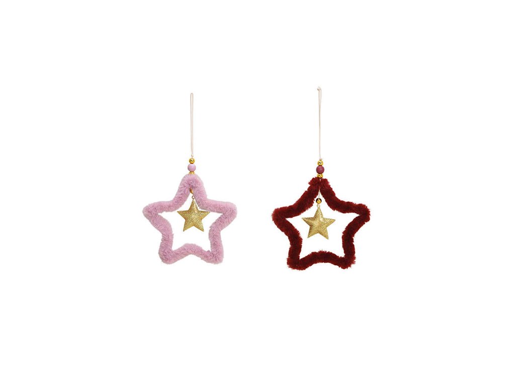 Vánoční závěsná dekorace na drátku - Hvězda. S touto vánoční dekorací můžete dozdobit Váš vánoční stromeček. Barva: světle růžová a bordó se zlatou hvězdou.Doplňkové parametry