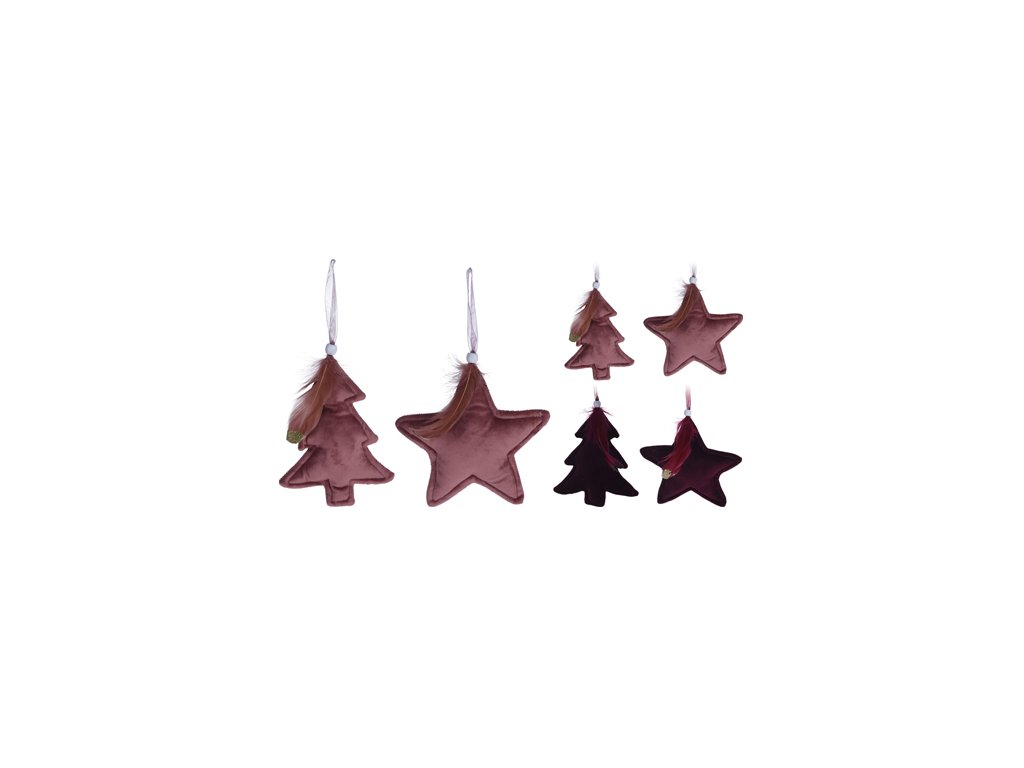 Vánoční závěsná dekorace ve tvaru hvězdy a vánočního stromku doplněna dekoračním pírkem. Délka šňůrky 8,5 cm. Barva: růžová a bordó. Materiál: plyš.Doplňkové parametry
