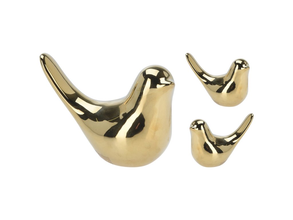 Stojící figurka ptáčka zlaté barvy.